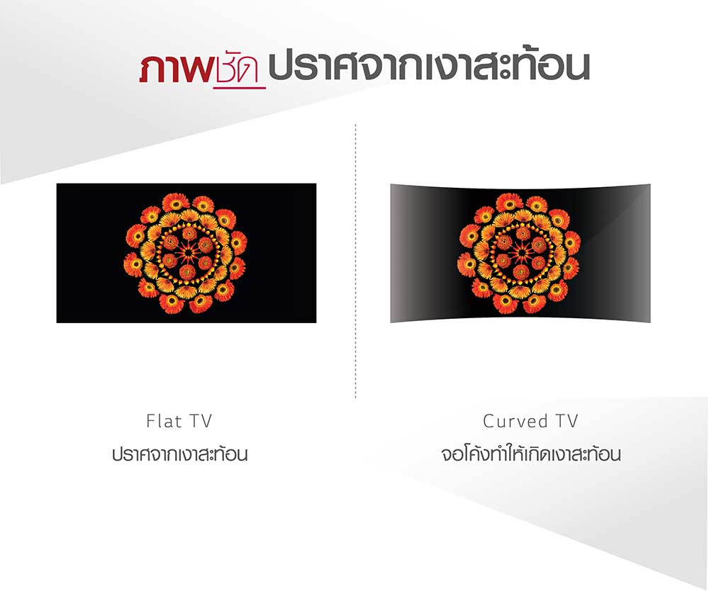 หากนึกภาพไม่ออกว่าขณะดูทีวีจอโค้งแล้วจะเกิดภาพแบบใด ให้นึกถึงการเล่นกับเงาสะท้อนของตนเองบนกระจกลวงตาตามสวนสนุก ซึ่งกระจกที่มีรูปทรงบิดเบี้ยวจะส่งผลต่อเงาสะท้อน ทีวีจอโค้งก็เช่นเดียวกัน ดีไซน์โค้งจะส่งผลต่อแสงตกกระทบและภาพบนหน้าจอที่บิดเบือนไป