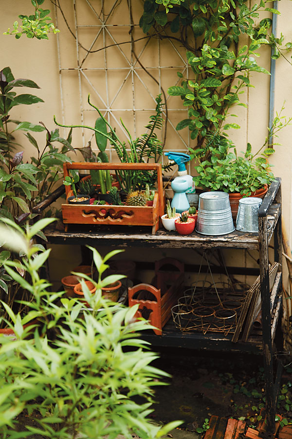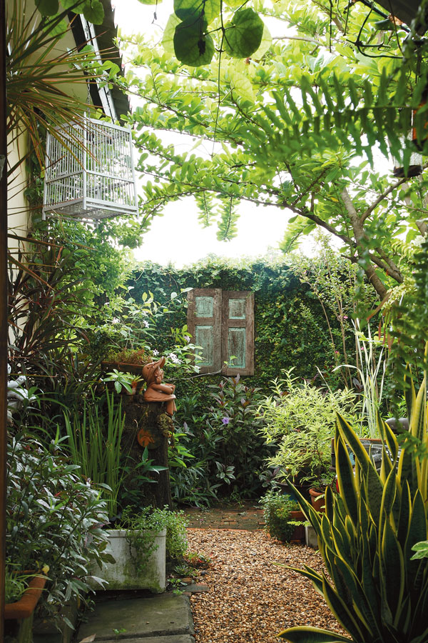 “ของตกแต่งบางชิ้นแม่เห็นผมชอบก็ซื้อมาฝาก บางชิ้นก็เก็บมาจากที่เขาไม่ใช้แล้ว จะสังเกตได้ว่าวัสดุส่วนใหญ่ในสวนจะเป็นวัสดุก่อสร้างที่เหลือจากไซต์งานของลุงซึ่งเป็นผู้รับเหมาจัดสวน เช่น แผ่นคอนกรีตปูพื้น ใช้ปูเป็นทางเดิน บล็อกซีเมนต์ลูกเต๋า นำมาทำเป็นที่กั้นขอบแปลง ต้นไม้ก็จะค่อยๆทยอยซื้อครับ ส่วนใหญ่แหล่งช็อปปิ้งของผมอยู่ที่ตลาดไท คลอง 15 และตลาดต้นไม้ธัญศิริ วันไหนเลิกงานเร็ว ก็แวะซื้อต้นไม้สักหน่อย เหมือนซื้อความสุขกลับบ้านครับ อย่างละนิดอย่างละหน่อย”