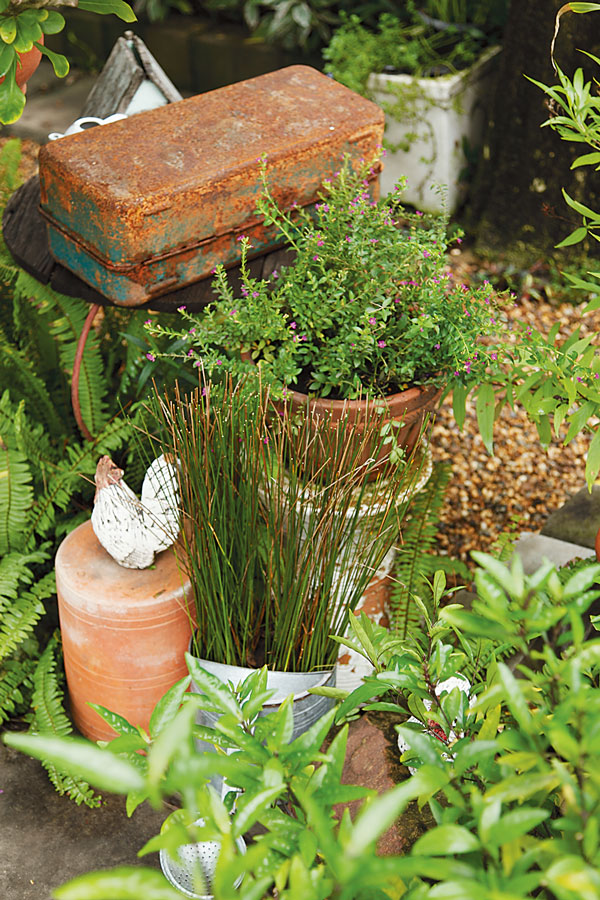 ถือเป็นสวนที่มีการมิกซ์แอนด์แมตช์ระหว่างของเก่าที่ไม่ได้ใช้แล้วกับของใหม่ที่เพิ่มเติมเข้ามา จัดวางแต่ละตำแหน่งโดยผ่านการคิดมาอย่างดี ผู้เขียนเองเห็นสวนบ้านคุณกานต์แต่งได้สนุกขนาดนี้ ก็คันไม้คันมืออยากกลับไปจัดที่บ้านใหม่เสียจริง