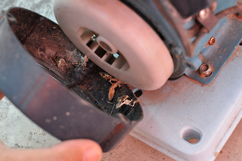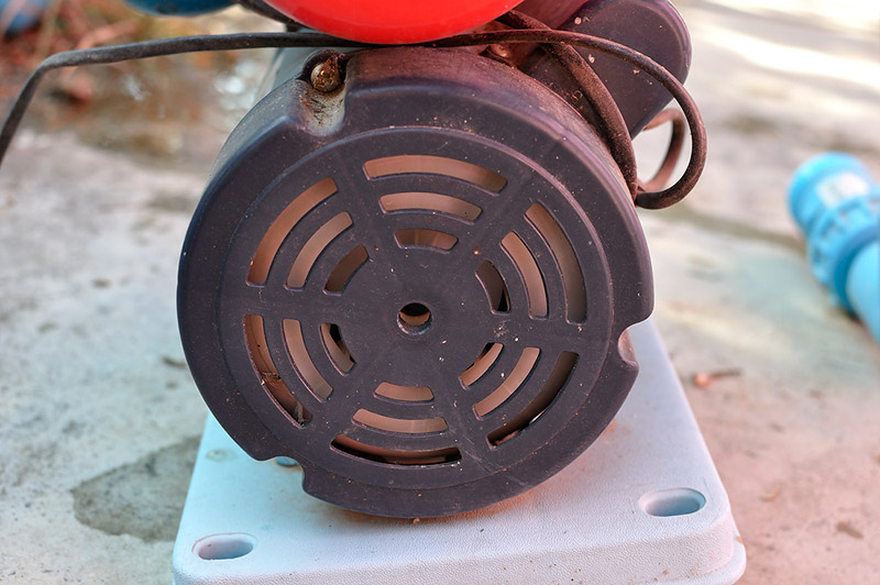 ที่ด้านหลังมอเตอร์ปั๊มน้ำ มีใบพัดเพื่อช่วยระบายความร้อนจากมอเตอร์ปั๊มน้ำ เป็นจุดที่จิ้งจกหรือแมลงต่างๆสามารถมุดเข้าไปได้ หรือถ้าวางปั๊มน้ำอยู่ใกล้พื้นสนามหญ้า หอยทากก็สามารถเข้าไปได้เช่นกัน ทำให้ ปั๊มน้ำเสียงดัง