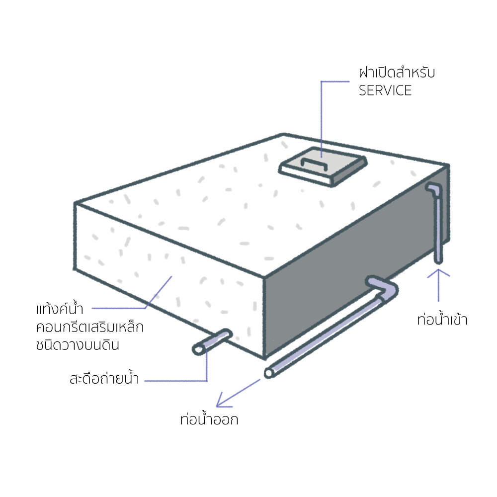 - แท็งก์คอนกรีตเสริมเหล็ก เหมาะกับบ้านขนาดใหญ่มีสนามและสวนกว้างๆ มีสระว่ายน้ำมีบ่อปลา จึงต้องการสำรองน้ำไว้ใช้งานในปริมาณมากๆ ซึ่งแท็งก์คอนกรีตจะมีอายุยาวนาน แข็งแรง ทึบแสง (ไม่เป็นตะไคร่) และสามารถออกแบบให้มีขนาดปริมาตรตรงตามความต้องการได้แม่นยำ แท้งค์คอนกรีตสามารถสร้างบนระดับดิน หรือฝังใต้ดินก็ได้ครับ ถังเก็บน้ำ