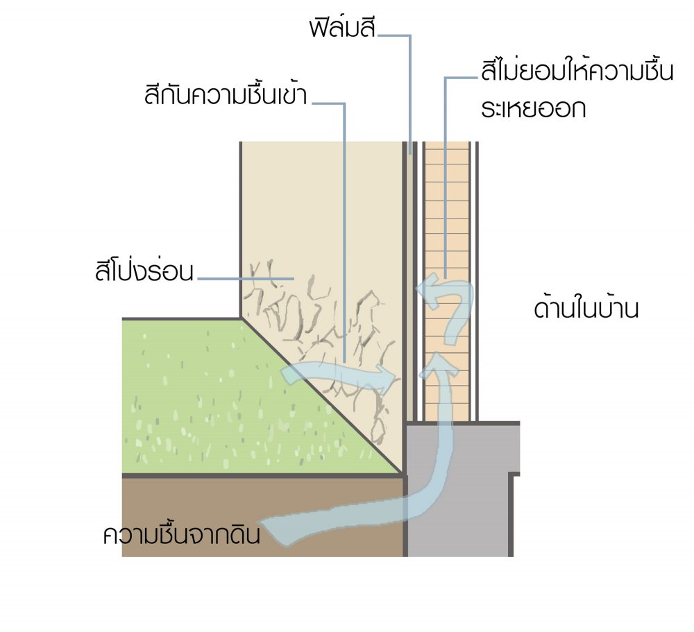 ปัญหา สีล่อน จากความชื้นของดินด้านล่างที่ซึมขึ้นมาตามผนังบ้านด้านใน ดันจนฟิล์มสีโป่งตัวออกและหลุดร่อนในที่สุด ยิ่งใช้สีที่มีคุณภาพดี ฟิล์มสีแน่นไม่ยอมให้ความชื้นผ่านได้ง่าย