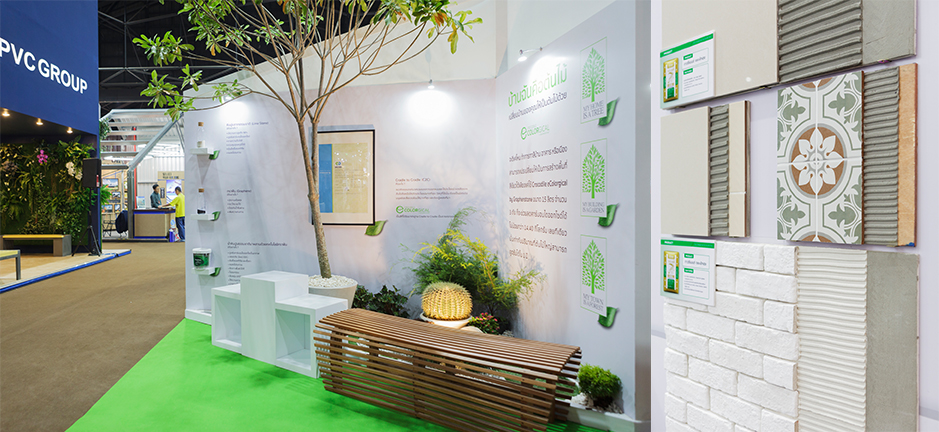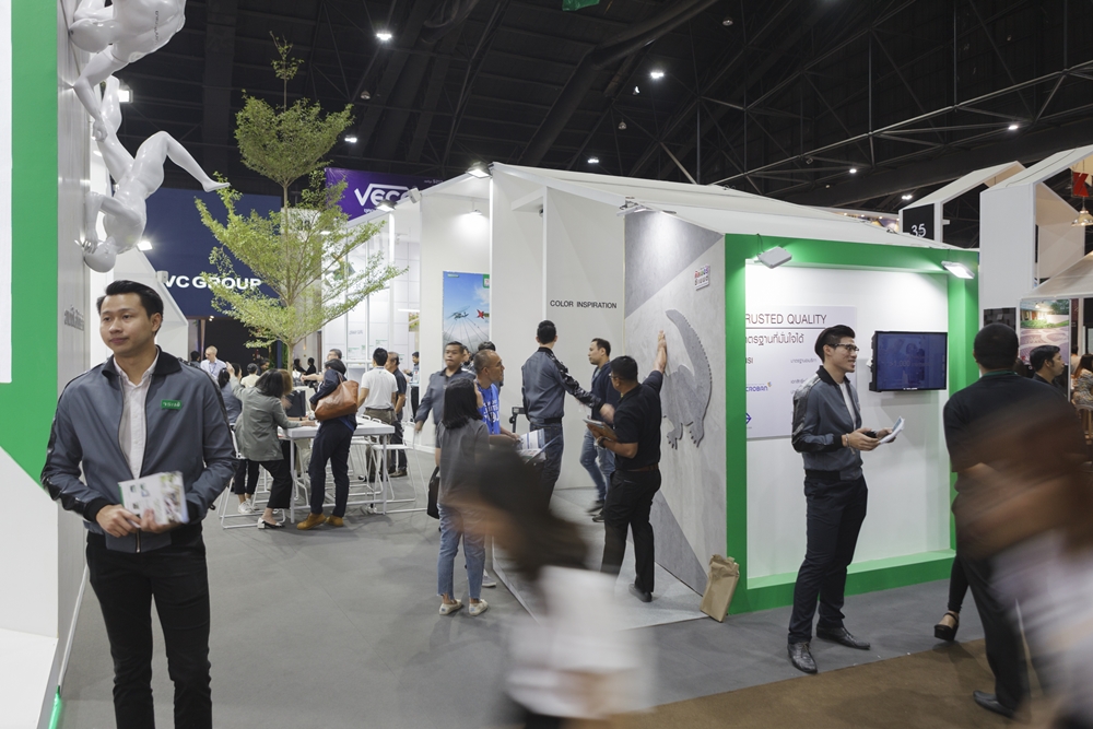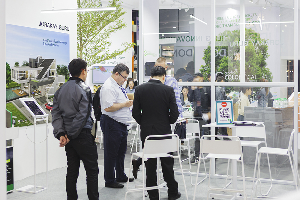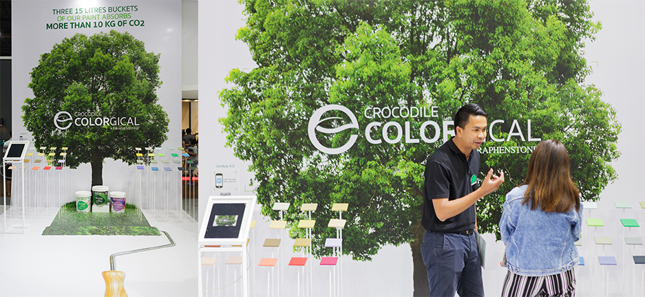 อีกมุมหนึ่งในบูธที่ใครมาเดินชมแล้วไม่ควรพลาด กับสินค้านวัตกรรมสุดล้ำของจระเข้ มาพร้อมลูกเล่นให้ผู้สนใจสามารถสแกน AR Code เพื่อให้ AR Code นี้เล่าเรื่องราวของสินค้าได้อย่างละเอียด นั่นคือ Zone สินค้า Highlight ที่มี Showcase ของ จระเข้ เทอร์โบ พลัส ซึ่งเป็น Package ขนาดใหม่ 0.5 กิโลกรัม และถัดไปอีกไม่ไกล คือ Showcase ของสินค้าใหม่เช่นกันอย่าง Crocodile eColorgical by Granphenstone หรือ eColor นวัตกรรมสีทาบ้านปลอดสาร VOC รูปแบบใหม่ที่ช่วยรักษาธรรมชาติได้เท่ากับการปลูกต้นไม้จริงเลยทีเดียว โดยสี eColor นี้ผลิตจากวัสดุธรรมชาติ ผสานกับข้อดีของหินปูน (Lime Stone) และ Graphene วัสดุ eColor ระดับนาโนที่เป็นเจ้าของรางวัลโนเบลในปี 2553 มีคุณสมบัติที่สามารถช่วยดูดซับก๊าซคาร์บอนไดออกไซด์ได้เท่ากับปริมาณที่ต้นไม้ใหญ่ 1 ต้น สามารถดูดซับได้ใน 1 ปี เมื่อใช้สีถังละ 15 ลิตร จำนวน 3 ถัง เป็นต้น