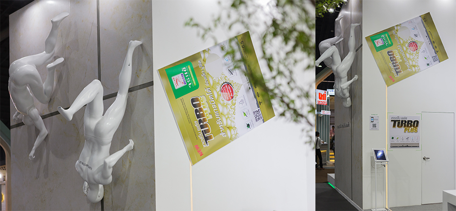ความน่าสนใจทั้งหมดเริ่มต้นกันที่จุดแรก จะสังเกตเห็นจอ LED ขนาดใหญ่ นั่นคือเวทีและจุด Meeting Point ที่ออกแบบพื้นที่บริเวณนี้ให้ส่วนการแสดงการเคลื่อนไหวของจระเข้ และการไหลตัวของกาวซีเมนต์ก่อรูปเป็นอาคารขึ้นมาได้อย่างน่าสนใจ โต้ตอบกันระหว่างจอ 2 ด้าน สะดุดตากับประติมากรรมมนุษย์เกาะบนผนัง สื่อถึงการยาแนวแบบเก่าต้องยอมแพ้ จระเข้ เทอร์โบ พลัส แสดงถึงคุณสมบัติไหลลึกเต็มร่องเล็ก อันเป็นจุดเด่นของสินค้านั่นเอง