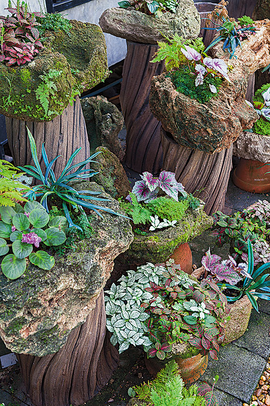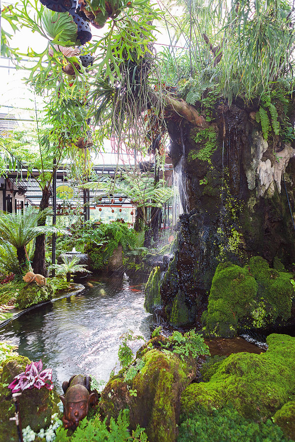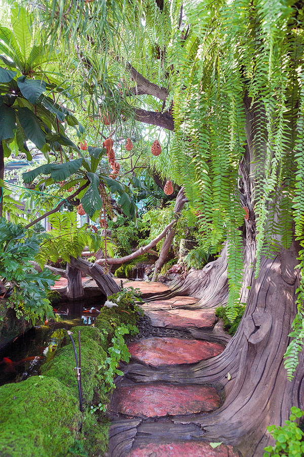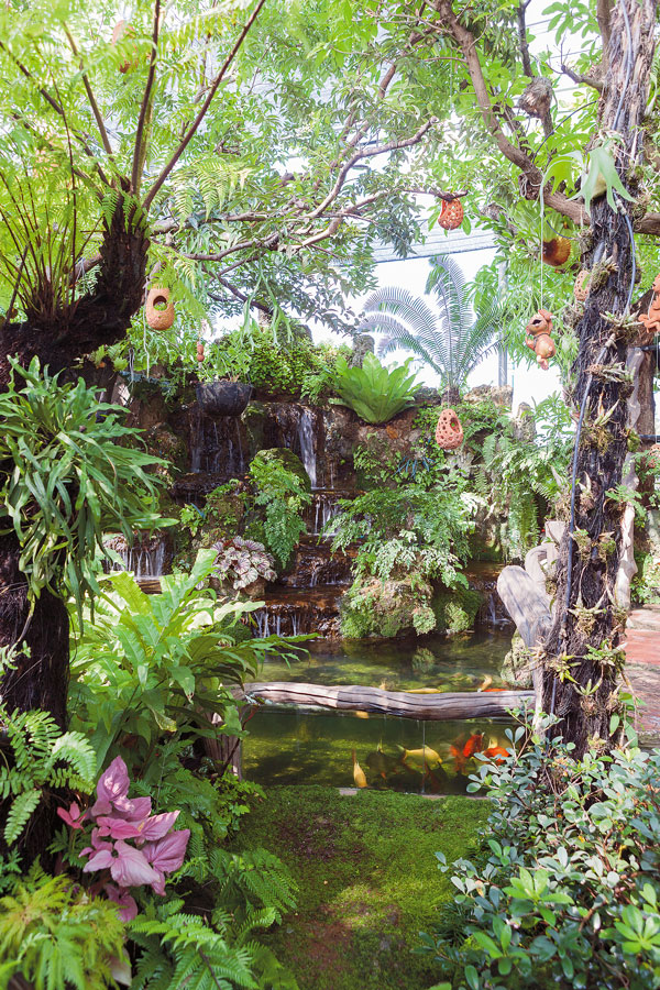“สวนป้าอินทร์มีมานานกว่า 10 ปีแล้วครับ เดิมเป็นแค่ร้านขายต้นไม้ทั่วไป สวนป้าอินทร์มี 2-3 สวนเป็นของพี่ๆ น้องๆ ของแฟน ผมมาแต่งงานเป็นลูกเขยบ้านนี้ครับ แรกๆก็จัดสวนไว้ดูเอง พอมีสวนสวยๆ ก็ทำให้เราอยากอยู่ร้านมากขึ้นและนานขึ้น เมื่อ 4-5 ปีก่อนเริ่มทำบ่อปลาและน้ำตกเล็กๆ หลังจากนั้นก็ทำมาเรื่อยๆ จนเป็นอย่างที่เห็น ผมออกแบบและลงมือทำกันเอง เรามีทีมคนงานรับจัดสวนอยู่แล้ว ระบบน้ำ น้ำตกลำธารก็ทำกันเอง จุดประสงค์หนึ่งที่ทำสวนก็เพื่อเป็นตัวอย่างให้ลูกค้าได้เห็น โดยส่วนตัวเป็นคนชอบพวกเฟินก้านดำ สไบนาง ทรีเฟิน หัสดำ เราก็นำมาแขวนๆวางๆไว้ในสวน ลูกค้ามาเห็นก็ขอซื้อ ร้านเราจะต่างจากร้านในละแวกนี้ที่มีเฟินแปลกๆ สวยๆ เยอะกว่า” คุณช้าง – กมล ตรงต่อกิจ เล่าถึงที่มาของสวนร้านป้าอินทร์ให้ฟัง