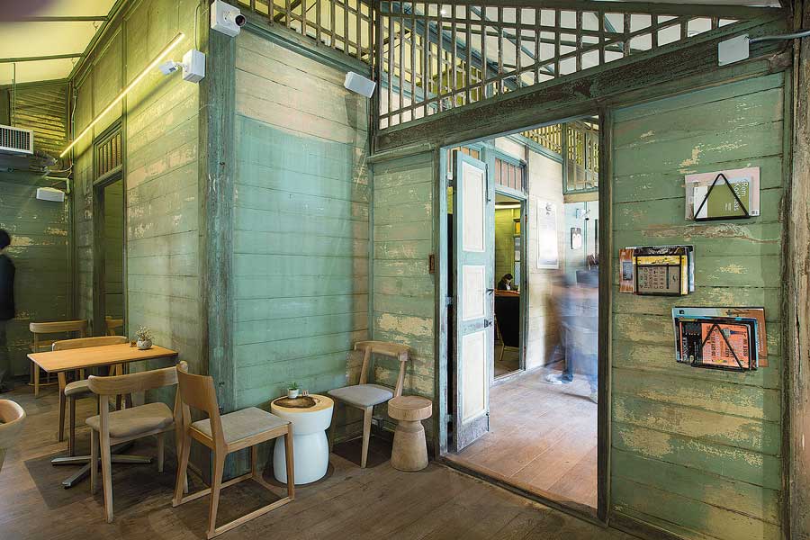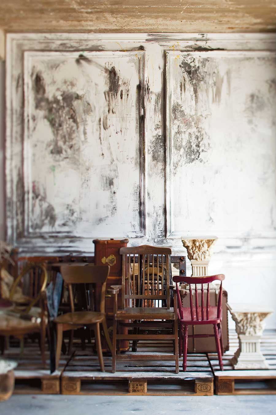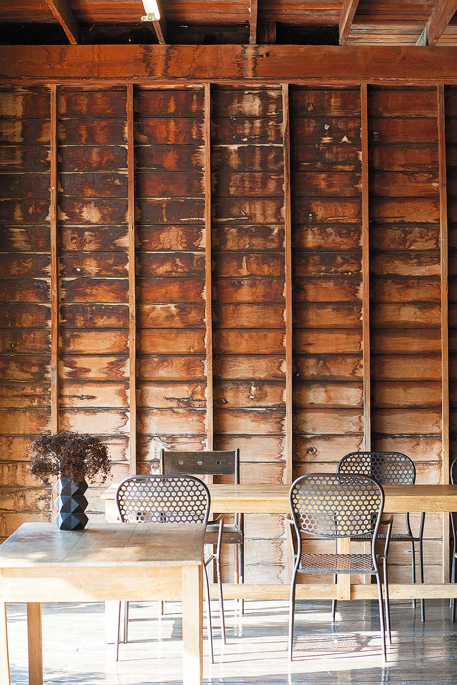 ไม้เก่าที่สีเริ่มลอกจะมองเห็นลายไม้เดิมๆได้เป็นบางจุด เทคนิคนี้ช่วยเสริมให้รู้สึกถึงความเก่าแก่ของของอาคาร เป็นการบอกเล่าเรื่องราวที่อยู่เบื้องหลังได้ดียิ่งขึ้น