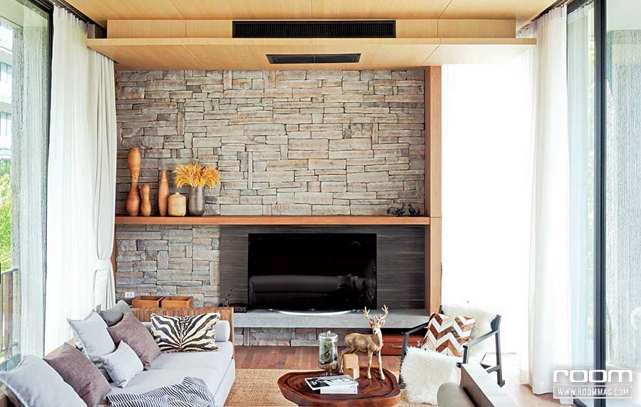 เปลี่ยนห้องรับแขกให้กลายเป็นบ้านพักตากอากาศ ด้วยการตกแต่งผนังด้วยหินธรรมชาติ สีสันธรรมชาติจากหินและไม้ช่วยสร้างความรู้สึกอบอุ่นให้บ้านได้อย่างดี ซึ่งปัจจุบันมีให้เลือกใช้ท้ังหินแท้และหินเทียม