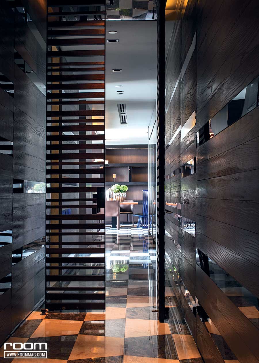 ผสมผสานวัสดุด้วยการนําแผ่นไม้โอ๊กโชว์เสี้ยนมาติดแบบแรนดอมกับแผ่นโลหะพื้นผิวมันวาวอย่างแผ่นอะลูมิเนียม สเตนเลส หรือกระจกสี สร้างความสวยและน่าสนใจได้อย่างลงตัว