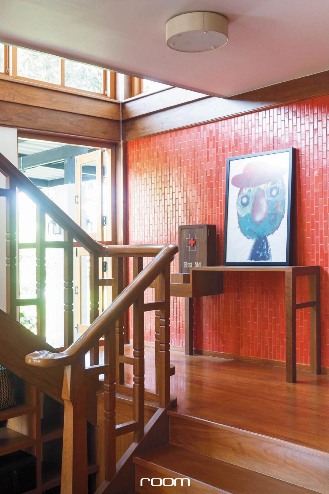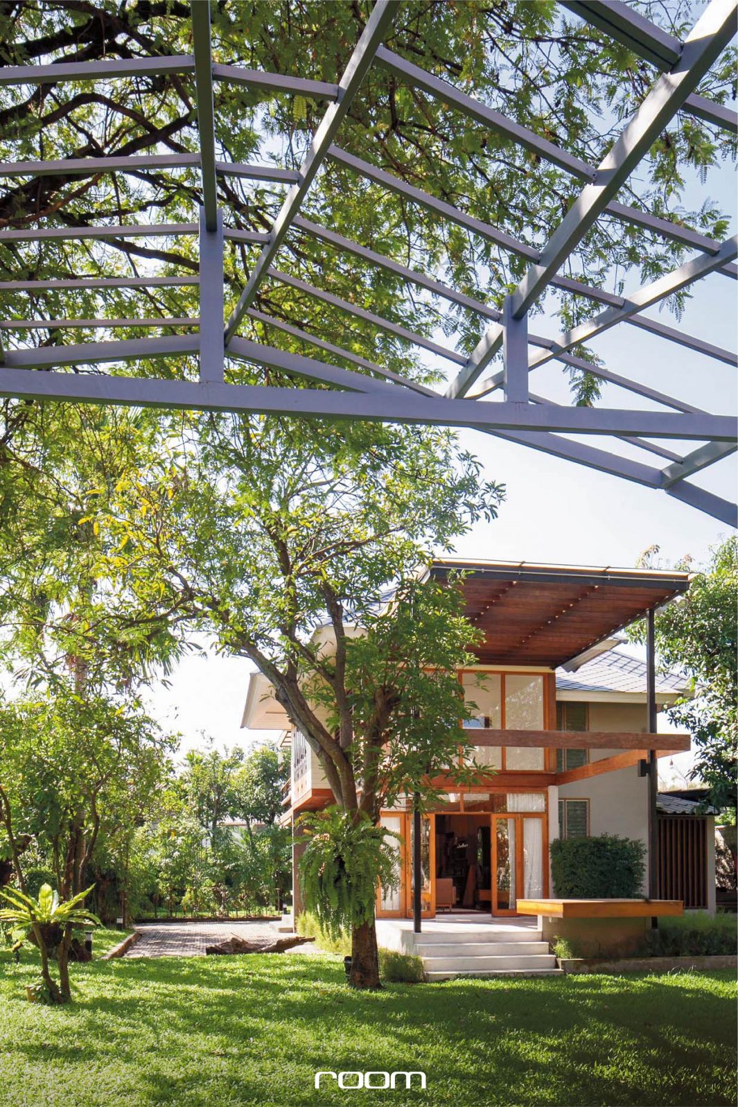 คุณพิมเล่าว่า การออกแบบพื้นที่ใช้สอยภายในบ้านมีการปรับเปลี่ยนบางส่วนเพื่อให้สอดคล้องกับวิถีชีวิตของครอบครัวสมัยใหม่ ไม่ว่าจะเป็นการต่อเติมพื้นที่รับแขกกับส่วนนั่งเล่นให้ใหญ่ขึ้น รวมถึงเพิ่มดับเบิ้ลสเปซโดยรื้อห้องพระบริเวณชั้น 2 ออก นอกจากน้ีจากท่ีเคยรับประทาน อาหารนอกเรือนชานก็ออกแบบห้องรับประทานอาหารเข้ามา ไว้ในตัวบ้าน ควบคู่ไปกับการต่อเติมและเพิ่มพื้นที่ระเบียง บริเวณช้ันล่างเพื่อเปิดรับธรรมชาติรอบบ้าน ชวนให้ออกมานั่งเล่นชมสวนตามมุมต่างๆ เช่น ชานขนาดกะทัดรัดบริเวณทางเข้าตัวบ้าน ชานโปร่งโล่งที่ต่อเนื่องจากห้องนั่งเล่นและชานในร่มสําหรับใช้งานได้อเนกประสงค์ ไม่ว่าจะรับประทานอาหาร จัดปาร์ตี้บาร์บีคิว หรือนอนเอกเขนกก็ยังได้ ส่วนช้ัน 2 ท่ีเป็นส่วนของห้องนอน นอกจากรื้อห้องพระออก เธอยังได้ทําห้องน้ําเพิ่มเพื่อความสะดวกสบาย
