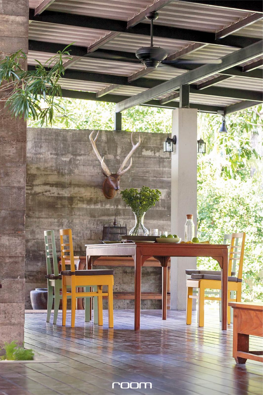 เพราะอยากให้ผนังส่วนครัวไทยท่ีสร้างขึ้นใหม่ ทําหน้าท่ีเป็นเสมือนแบ็กดร็อป จึงเลือกใช้ผนังคอนกรีตทึบ โชว์ร่องรอยไม้แบบท่ีเกิดจากกระบวนการหล่อ