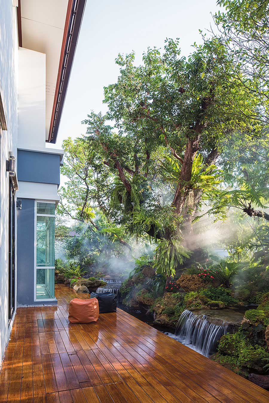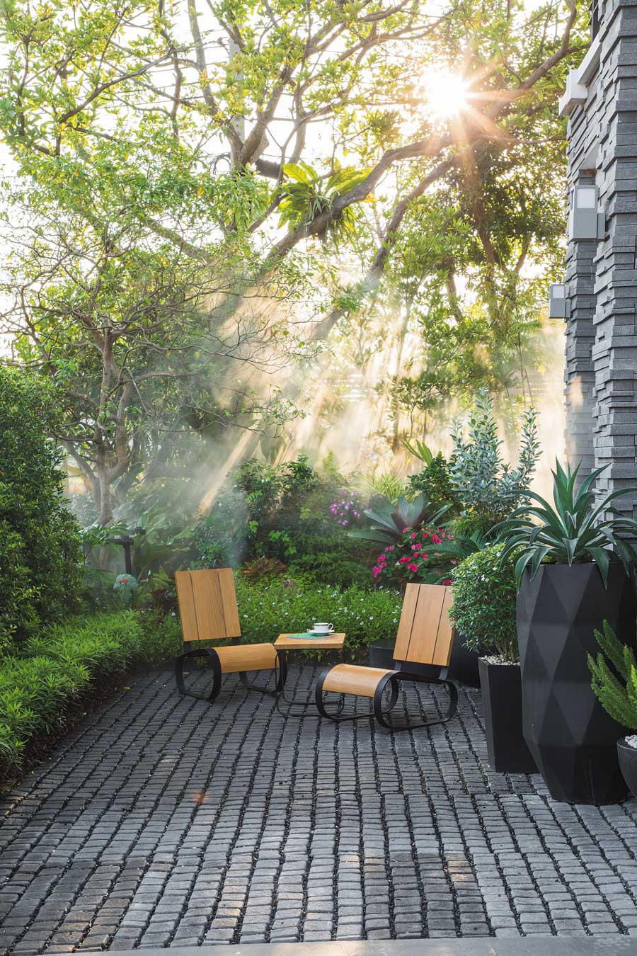 เราออกเดินทางกันตั้งแต่ฟ้ายังไม่ทันสว่าง เพื่อรอเวลาให้แสงแดดอ่อนๆส่องลอดผ่านพุ่มไม้เกิดเป็นแสงเงาที่สวยงามเมื่อกระทบกับหมอกจางๆของละอองน้ำที่เปิดให้ความชุ่มฉ่ำแก่ต้นไม้และช่วยเพิ่มความเย็นสบายให้สวน สีเขียวของพุ่มไม้ที่โอบล้อมมุมมองโดยกว้างทำให้คอร์ตยาร์ดมุมรับแขกหน้าบ้านดูกว้างขึ้นมาทันที นี่เป็นฝีมือการออกแบบของ คุณดอส-ปณัฐ สุมาลย์โรจน์ นักจัดสวนจากบริษัทเพอโกล่าร์ จำกัด ที่เคยฝากผลงานในนิตยสารบ้านและสวนมาแล้วหลายฉบับ คุณดอสเล่าถึงที่มาของสวนให้ฟังว่า