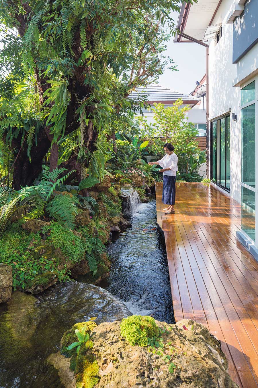 “พื้นที่เดิมมีสนามหญ้าและต้นไม้ใหญ่เหมือนบ้านจัดสรรทั่วไป มีพื้นที่ตรงกลางที่เชื่อมระหว่างบ้านสองหลัง ทำให้มีสเปซที่เปิดโล่งจึงไม่รู้สึกแคบมาก ความจริงก่อนหน้านี้ผมมีโปรเจ็กต์ที่ต้องเข้ามาคุยกับเจ้าของบ้าน แต่ไม่ใช่งานจัดสวน ระหว่างนั้นเขานำแบบสวนเดิมซึ่งเป็นสไตล์โมเดิร์นเรียบง่าย มีบ่อเลี้ยงปลา และต้นไม้ที่มีจำนวนพอที่เจ้าของบ้านสามารถดูแลได้ง่ายมาให้ผมดูเพื่อขอคำแนะนำ ผมลองให้เขาดูรูปแบบสวนจากผลงานที่เคยทำว่าชอบแบบไหน เพื่อหาคำตอบและความต้องการที่ชัดเจนมากขึ้น จนสุดท้ายมาค้นพบว่าชอบสไตล์สวนทรอปิคัลเรนฟอเรสต์ แต่ติดปัญหาเพียงอย่างเดียวว่ามีพื้นที่ค่อนข้างจำกัด ซึ่งผมก็ตอบไปว่าทำได้และทำแบบมาเสนอ แต่ยังคงฟังก์ชันของบ่อเลี้ยงปลาเอาไว้เหมือนแบบแรกเช่นเดิม