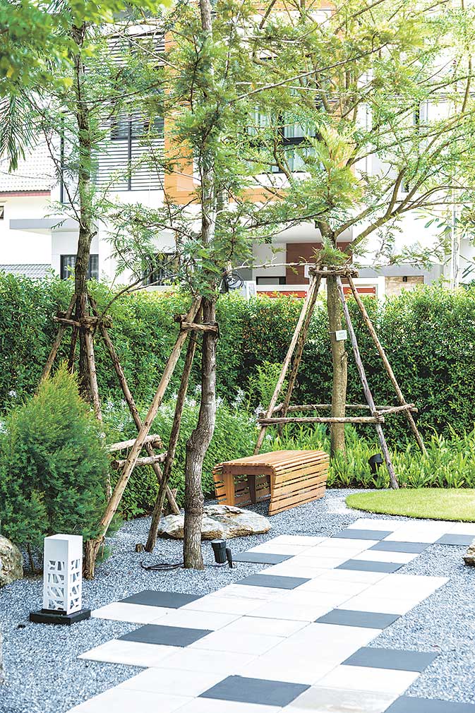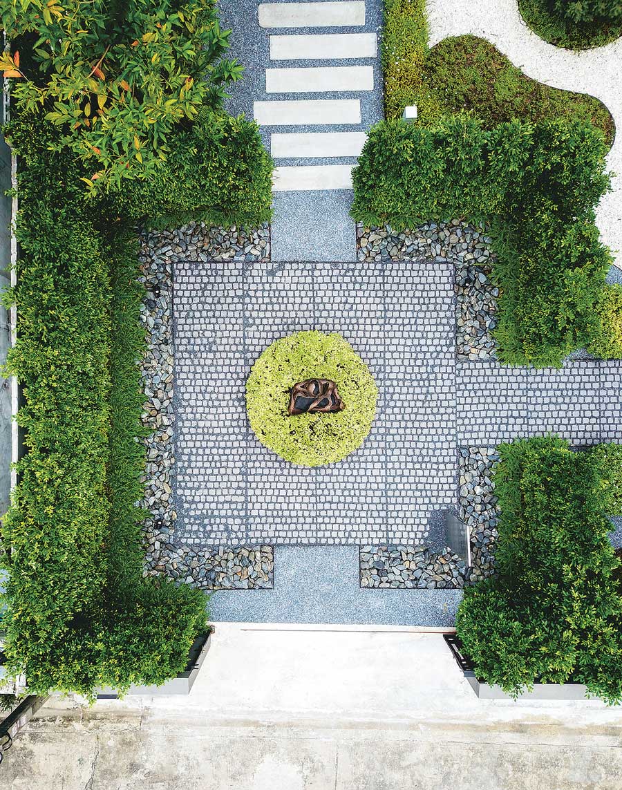 คุณดอส -ปณัฐ สุมาลย์โรจน์ ผู้ออกแบบสวนแห่งนี้เล่าถึงความเป็นมาของสวนให้ฟังว่า “เดิมที่ตรงนี้เป็นบ้านเก่า คณสุรพงษ์ซื้อเก็บไว้ แล้วทุบบ้านทิ้งทั้งหมด อยากทำให้เป็นที่พักผ่อนสำหรับครอบครัว โจทย์ที่ได้รับในตอนแรกคืออยากได้สถานที่ที่ร่มรื่นสำหรับพักผ่อนเดินเล่นหลังเลิกงาน เขียนงาน นั่งวิปัสสนาทำสมาธิ ครั้งแรกผมก็นึกถึงสวนป่า (Rain Forest) ที่มีต้นไม้เยอะๆ อารมณ์ประมาณเสถียรธรรมสถานหรือเปล่า ซึ่งจริงๆ ถามว่าทำได้ไหมก็สามารทำได้ครับ แต่เราก็จะได้แค่สวนที่มีความสงบร่มรื่นใช้สำหรับพักผ่อนเท่านั้น ผมอยากได้สวนที่ทำให้คนที่เข้ามาใช้ได้คิด ได้เกิดมุมมอง ประกอบกับภรรยาเจ้าของชอบศึกษาธรรมะด้วย ผมเลยเสนอไอเดียสวนที่ใช้คอนเซ็ปต์มาจากพุทธคติ ยึดหลักคำสอนทางพระพุทธศาสนาบางอย่างมาใช้ ลองคัดกรองดูว่าจะนำเรื่องอะไรมาใช้ดี อิทธิบาท 4 หรือสังคหวัตถุ4 ดีไหม แต่พิจารณาดูแล้วเหล่านี้ก็แค่บทคำสอนย่อยๆ ถ้าเราจะพูดถึงองค์รวมจริงๆ อริยสัจ 4 น่าจะเหมาะกว่าทำให้อารมณ์สวนโดยรวมดูนิ่งๆแต่ในความนิ่งก็อยากให้เกิดมุมมองและแง่คิดได้หลากหลายมากขึ้นครับ”