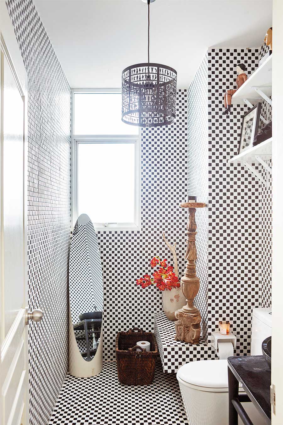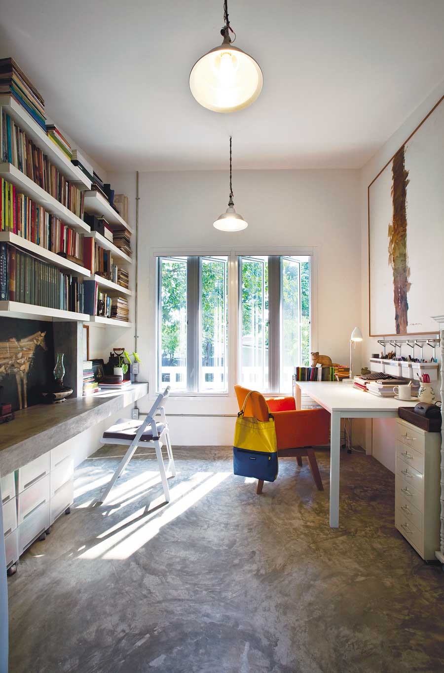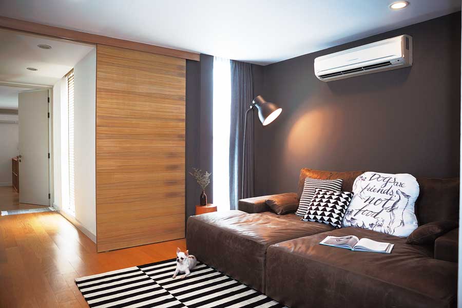 แก้ปัญหาความอึดอัดให้มุมเล็กและแคบหรือมุมที่มีการใช้โทนสีเข้มด้วยการเปิดให้แสงธรรมชาติเข้ามาผ่านหน้าต่างบานสูงจรดฝ้า พร้อมใช้สีแบบคุมโทน ไม่ว่าจะเป็นสีขาว-ดำหรือน้ำตาลเข้ม ก็ทำให้มุมเล็กๆเกิดมิติจากสีสันแบบโทนสีเดียว