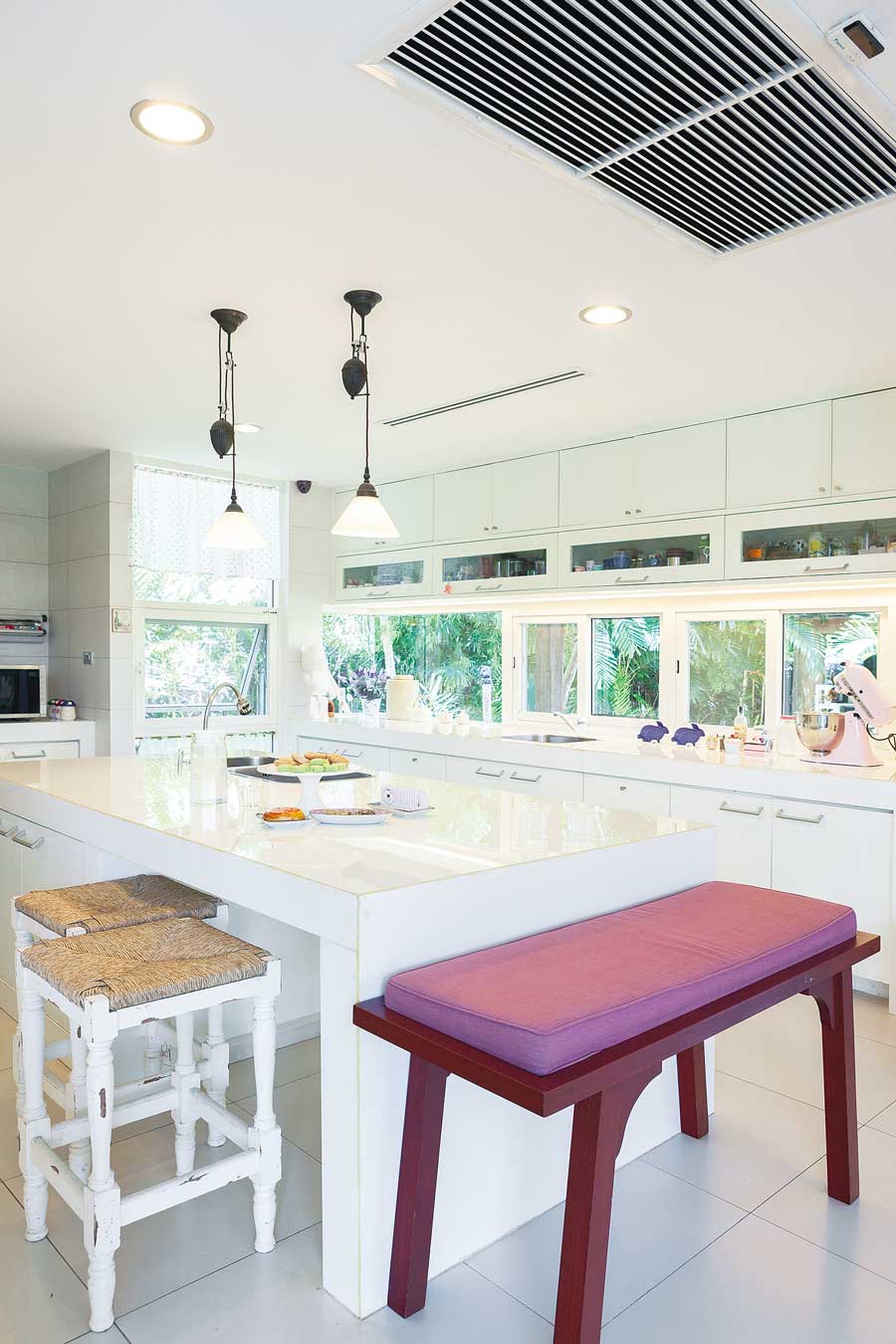 ห้องครัวที่ดีต้องสามารถระบายอากาศได้อย่างสะดวก การทำหน้าต่างบานเล็กโดยรอบแบบนี้นอกจากช่วยระบายกลิ่นและควันขณะประกอบอาหารแล้ว ยังมองเห็นธรรมชาติภายนอก เปลี่ยนอารมณ์ครัวแบบเดิมให้ดูน่าใช้งานมากขึ้น
