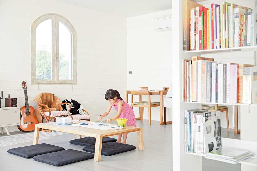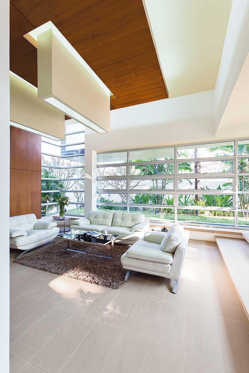 ห้องรับแขกที่ออกแบบกรอบหน้าต่างซอยเป็นรูปสี่เหลี่ยมผืนผ้า ช่วยให้ห้องที่มีฝ้าเพดานสูงดูไม่เวิ้งว้างจนเกินไป และมีบรรยากาศน่าสบายจากการเปิดรับแสงธรรมชาติ