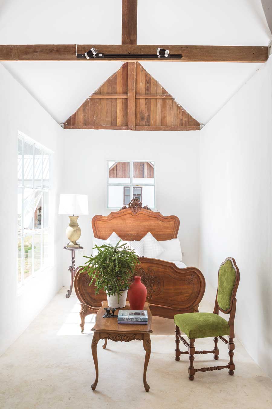 ระเบียงเล็กๆเชื่อมต่อกับห้องนอนที่ออกแบบให้โปร่งสบายด้วยการใช้อิฐช่องลมและหน้าต่างบานสูง จึงเปิดรับแสงและลมได้ดี รวมถึงสร้างแสงเงาที่ดูน่าสนใจอีกด้วย