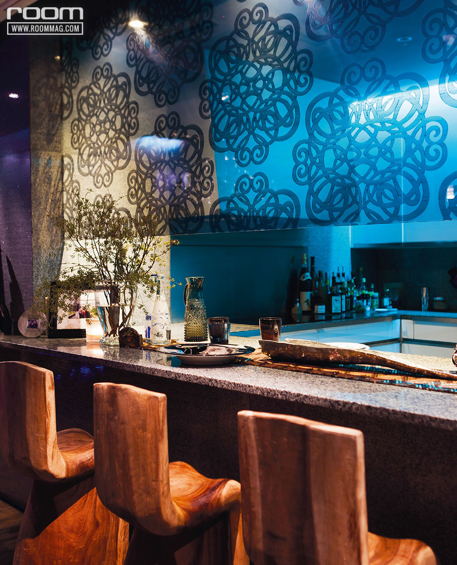 กั้นแบ่งพื้นที่ห้องครัวสีสันแบบโอเพ่นด้วยกระจกลามิเนตกรุลายลูกไม้สังทำพิเศษ ตกแต่งภายในด้วยไฟแอลอีดีเปลี่ยนสีได้ กลายเป็นไพรเวตบาร์ในแบบที่ไม่เหมือนใคร