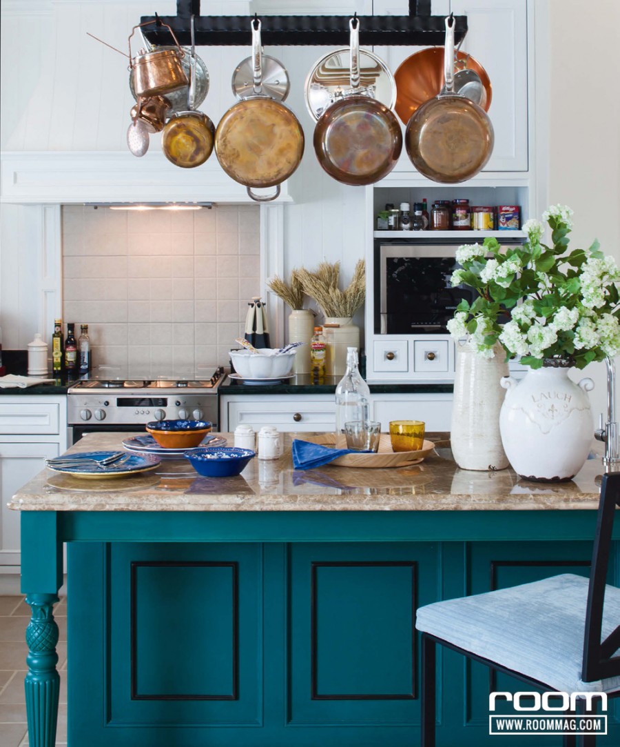 เพียงมีไอส์แลนด์ท็อปหินอ่อนสีเขียวเทอร์คอยส์เป็นจุดนำสายตา ท่ามกลางชุดครัวสีขาว และกระเบื้องพื้นและผนังสีเอิร์ธโทน ก็ช่วยสร้างครัวสีสันแห่งนี้ให้แสนสดชื่นแบบวินเทจสะอาดตา