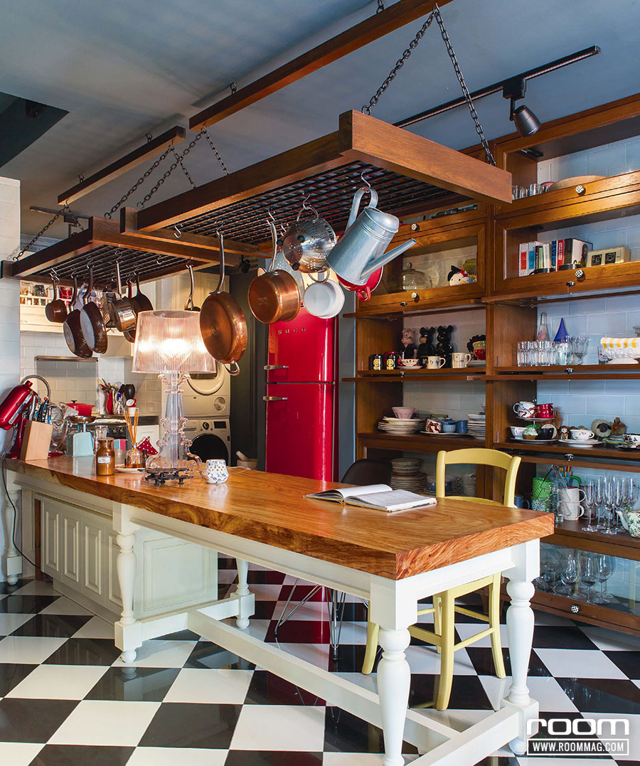 พื้นบ้านลายตารางหมากรุกปูด้วยกระเบื้องแกรนิตโต้สีขาว-ดํา ตัดขนาด 30×30เซนติเมตร เข้ากันได้ดีกับสีสันที่มาจากเครื่องครัว และเครื่องใช้ไฟฟ้าอย่างตู้เย็นที่กลายมาเป็นเฟอร์นิเจอร์ชิ้นมาสเตอร์พีซของครัวสีสันแห่งนี้