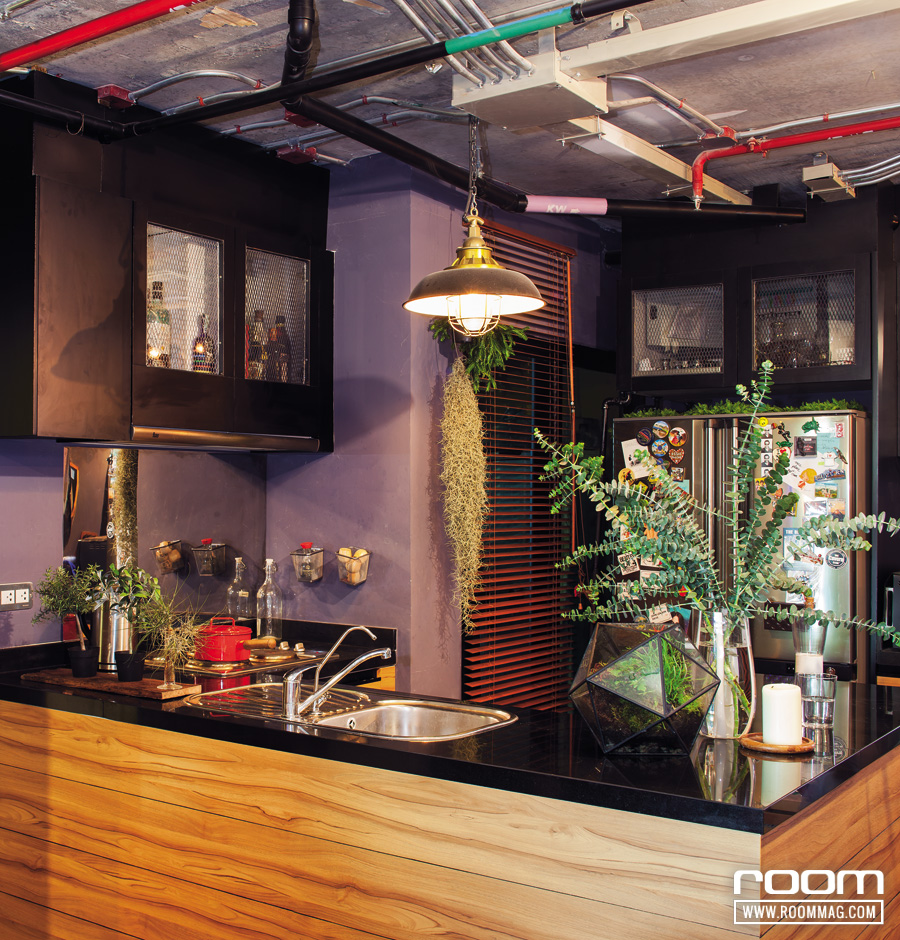 แม้พื้นที่ห้องขนาดเล็ก ก็สร้างสรรค์ครัวสีสันได้ ด้วยเคาน์เตอร์กรุไม้โชว์ลวดลายและท๊อปหินสีดำ ตัดกันกับผนังสีม่วงที่ช่วยเสริมลุกให้ดูเรียบหรูมากยิ่งขึ้น ไม่ลืมตกแต่งด้วยความสดชื่นของต้นไม้สีเขียวที่ช่วยสร้างชีวิตชีวาให้กับมุมครัว