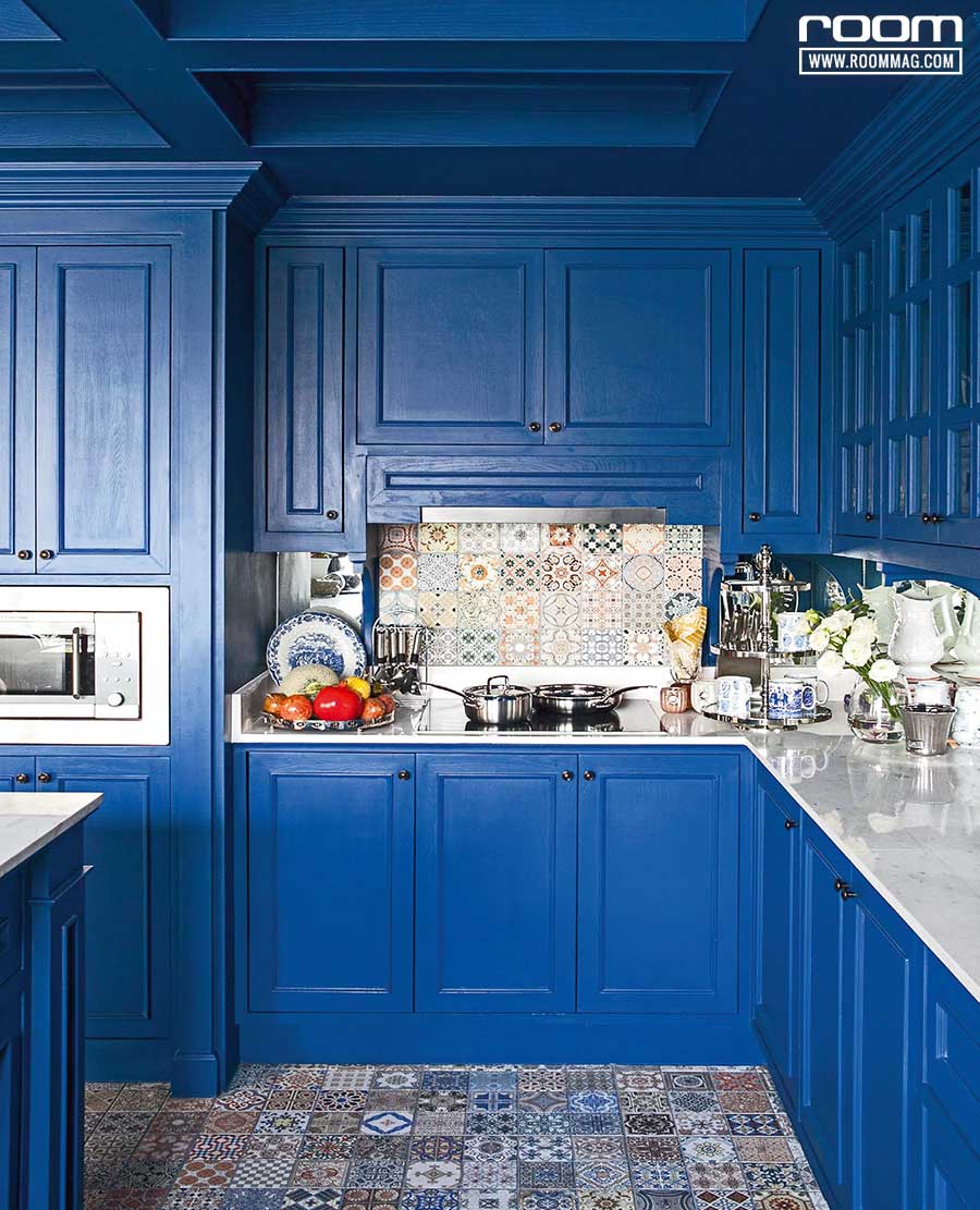 สร้างสีสันและแพตเทิร์นให้กับครัวด้วยการปูกระเบื้องพื้นและผนังบางส่วนด้วยกระเบื้องดินเผาลายวินเทจ ตัดกับตู้หน้าบานลูกฟักสีน้ำเงิน Great Harbor เพิ่มบรรยากาศคลาสสิกแบบเก๋ไก๋ให้กับครัวสีสัน