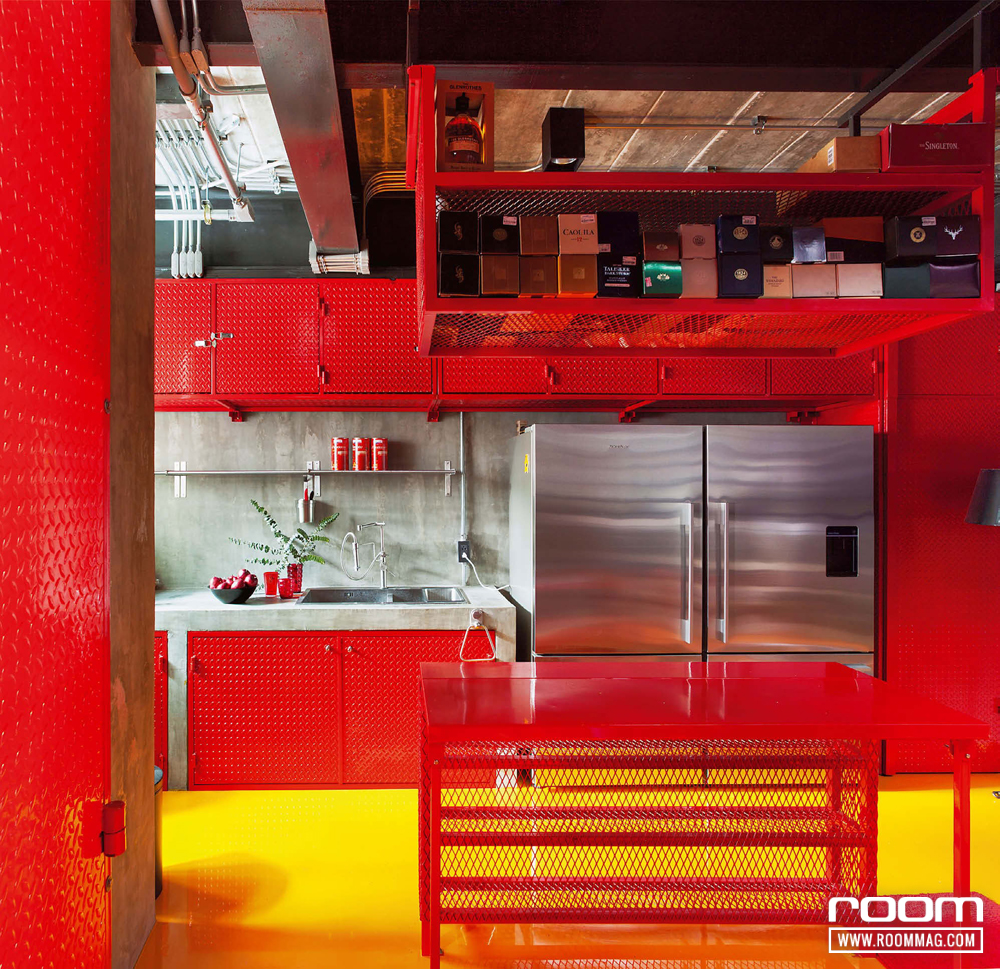 ห้องครัวสีสันจากสีหลักที่เป็นสีแดง สะท้อนการผสมผสานสีสันกับความดิบเท่สไตล์อินดัสเทรียลที่ไม่เหมือนใคร ตัดกับพื้นอีพ็อกซี่สีเหลืองซึ่งเป็นสีคู่ตรงข้าม เคาน์เตอร์ครัวทำจากคอนกรีตขัดมัน ด้านในทำตู้เก็บของบิลท์อินจากแผ่นเหล็กตะแกรงลายกันลื่น