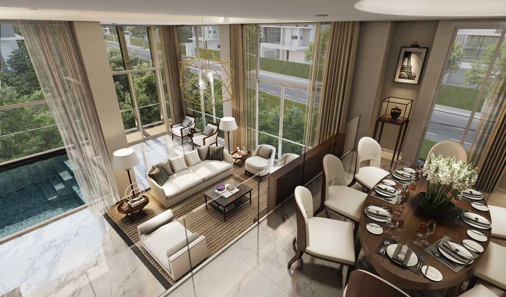 ต่อเนื่องไปชั้น 3 ที่ออกแบบไว้เสมือนว่าที่นี่เป็นรีสอร์ทส่วนตัว ด้วยโถงเพดานสูงถึง 4.3 เมตร กรุผนังกระจกใสรอบด้านเปิดวิวให้เห็น City Scape ในยามค่ำคืน เชื่อมต่อกับสระว่ายน้ำส่วนตัวเป็นหนึ่งเดียวกันทั้งชั้น นอกจากนี้ยังแบ่งสัดส่วนพื้นที่ให้เกิดปฎิสัมพันธ์ด้านการใช้งานอย่าง Living zone ที่วางโซฟาตัวหนานุ่มต่อเนื่องกับโต๊ะรับประทานอาหารตัวใหญ่ ใกล้ๆ เป็นชุดแพนทรีสำหรับปรุงอาหารอย่างง่าย เติมเต็มการใช้งานให้เกิดความต่อเนื่อง