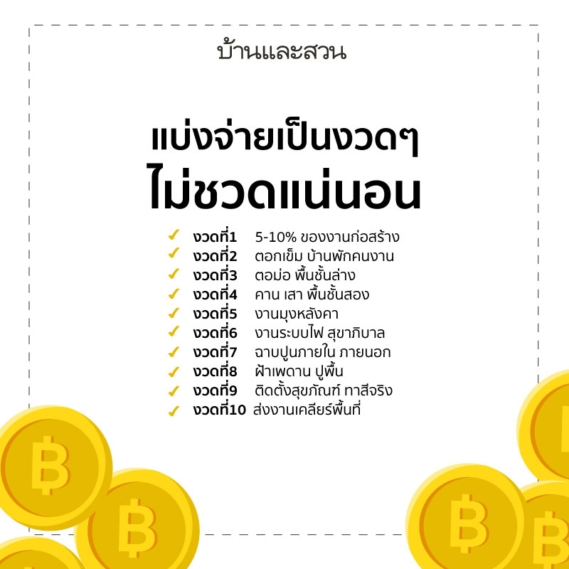 อันนี้สำคัญต่อให้เชื่อใจมากแค่ไหนก็อย่าจ่ายค่าจ้างก้อนเดียวหนักๆ เพราะอนาคตอะไรก็เกิดขึ้นได้ ควรแบ่งจ่ายเป็นงวดๆ ตามสเต็ปต์งานก่อสร้างซึ่งแบ่งเป็นงวดต่างๆ ดังนี้