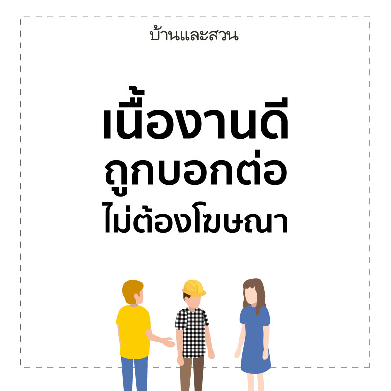 ว่ากันว่าการตลาดที่ดีที่สุดคือการบอกต่อ คนในยุค4.0 ต่างให้ความเชื่อใจสินค้าที่ผ่านการรีวิวของคนมีชื่อเสียง เป็นที่รู้จักในวงกว้าง แต่การบอกต่อหรือแนะนำผู้รับเหมานั้นไม่ได้ง่ายเหมือนอย่างการรีวิวสินค้าทั่วไป เพราะต้องผ่านด่านหินสร้างผลงานที่น่าเชื่อถือมีคุณภาพอย่างแท้จริง การคัดเลือกผู้รับเหมาสร้างบ้าน คงไม่ต้องถึงขั้นให้คนมีชื่อเสียงมารีวิวในสิ่งที่สร้างมา แต่หากผลงานการสร้างบ้านที่ผ่านมาได้รับการยอมรับจากลูกค้าเดิมที่เป็นบุคคลที่เราน่าเชื่อถือ ไว้ใจได้ ก็สมควรรับพิจารณาไว้เพราะการเข้าไปนั่งอยู่ในใจลูกค้าจนกล้าบอกต่อนั้นไม่ใช่เรื่องง่ายเลยทีเดียว