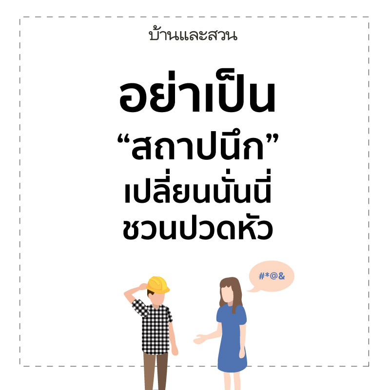 สิ่งหนึ่งที่เป็นปัจจัยให้ผู้รับเหมาต้องยกเลิกสัญญาหรือบางกรณีก็ทิ้งงานไปเลยนั้นคือ ตัวเจ้าของบ้านเอง ที่มักจะตัวเองให้เป็น “สถาปนึก” เล่นเปลี่ยนแบบ เปลี่ยนสเปกวัสดุรายวันก็ชวนปวดหัว จะทำอย่างไรให้ผู้รับเหมาสร้างบ้านแสนรักของเราจนเสร็จสมบูรณ์มีวีธีดังนี้