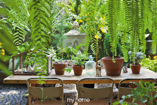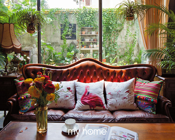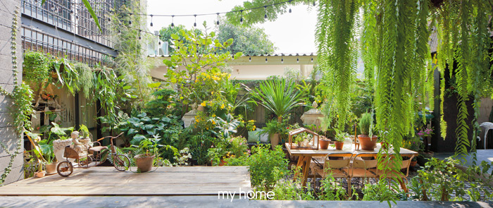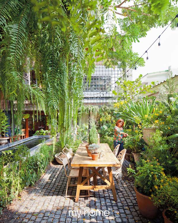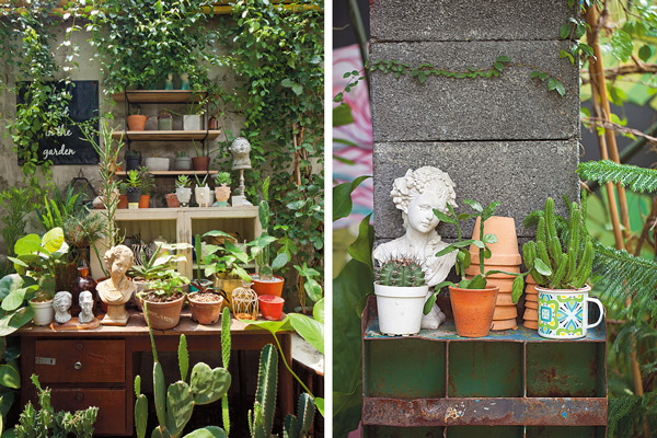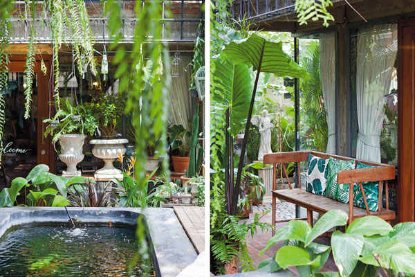 ด้วยความช่างเลือก และ ช่างสรรหาทําให้บ้านหลังนี้เต็มไปด้วยของสะสมมากมาย “ พี่สามารถจัดบ้านใหม่ได้เรื่อย ๆ นะเพราะของเรามีมาเพิ่มตลอด หรือ บางครั้งก็สลับกับเปลี่ยนกับที่ร้านอาหารนํากลับมาดูแลบ้าง ทําให้บ้านเป็นเหมือนแหล่งอนุบาลต้นไม้ขนาดย่อมไปในตัว สวนนี้ส่วนใหญ่จึงเน้นเป็นไม้กระถาง ที่สามารถเคลื่อนย้ายได้สะดวก แต่นอกจากพื้นที่สวนนอกบ้านแล้วในบ้านเองพี่ก็ยกไม้กระถางเข้ามาตกแต่งไว้ตามมุมต่าง ๆ ด้วย ซึ่งจริง ๆ แล้วการปลูกต้นไม้ในบ้านดูแลไม่ยากนะ ถ้าเรารู้จักธรรมชาติของต้นไม้ อย่างถ้าเอากระถางไหนเข้ามาอยู่ในบ้าน เราก็อย่ารดน้ําเยอะจนเกินไป แล้วก็อย่าลืมสลับออกไปตากแดดรับลมข้างนอกบ้างแค่นั้นเอง ”