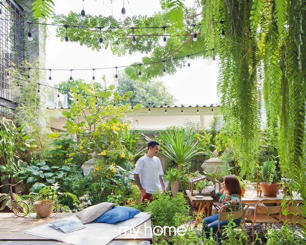 บรรยากาศความสุขสดชื่นของสิ่งต่าง ๆ ภายในสวนหน้าบ้านนี้ ล้วนแล้วแต่มีจุดเริ่มต้นมาจากความสุขของคนในครอบครัว โดยคุณเหน่ง-สุทธินนท์ ทองสุข และ คุณเล็ก-จินตนา ทองสุข คู่สามี-ภรรยาที่มักใช้เวลาส่วนใหญ่ไปกับการออกแบบ จัดแต่งบ้าน “ การแต่งบ้าน และการปลูกต้นไม้คือความสุขค่ะ พี่รู้สึกว่าถ้าบ้านเรามีต้นไม้ก็จะทําให้บรรยากาศสดชื่นขึ้นมาทันทีเลย อย่างต้นอินทนิลหน้าบ้านเป็นต้นไม้เก่าที่ตั้งใจล้อมเพื่อ ย้ายมาปลูกไว้ที่นี่ เพราะพี่เชื่อว่าไม่ว่าบ้านจะมีพื้นที่ แค่ไหนก็ตาม ก็ต้องมีต้นไม้ใหญ่ไว้ให้ร่มเงาสักหนึ่งต้น
