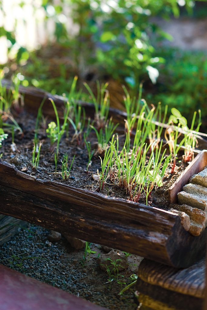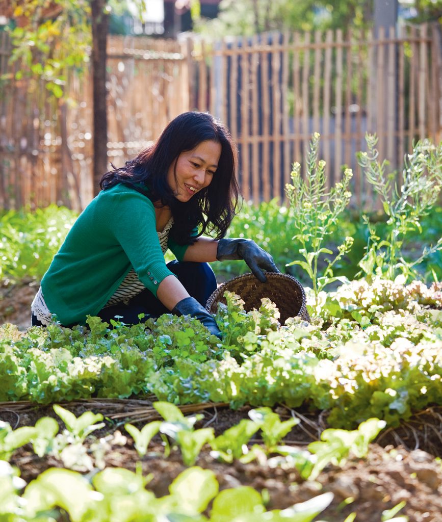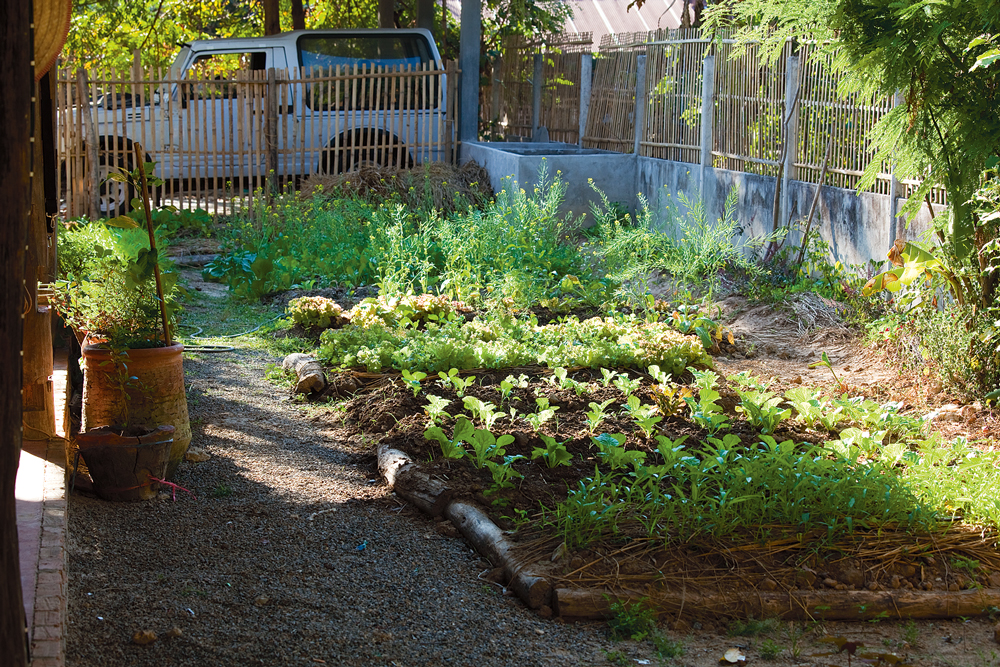 คุณมิ้นพาเราเดินชม แปลงผักสวนครัว ที่อยู่อีกฟากของฝั่งคลอง ซึ่งเธอปรับพื้นที่ทำเป็นแปลง ปลูกผัก ไว้รับประทานเองได้อย่างน่ารัก พื้นที่ 40 ตารางเมตร ประเภทผักที่ปลูกคือ ผักกาด ผักบุ้ง กวางตุ้ง ตั้งโอ๋ ต้นหอม ผักโขม และผักสลัด เช่น เรดโอ๊ก มีห้องทำงานแบบส่วนตัวของคุณเอ๋ให้นั่งรับลมชมสายน้ำ ทั้งยังเป็นมุมโปรดของเด็กๆ ที่มัก วิ่งเล่นซ่อนแอบกันอีกด้วย