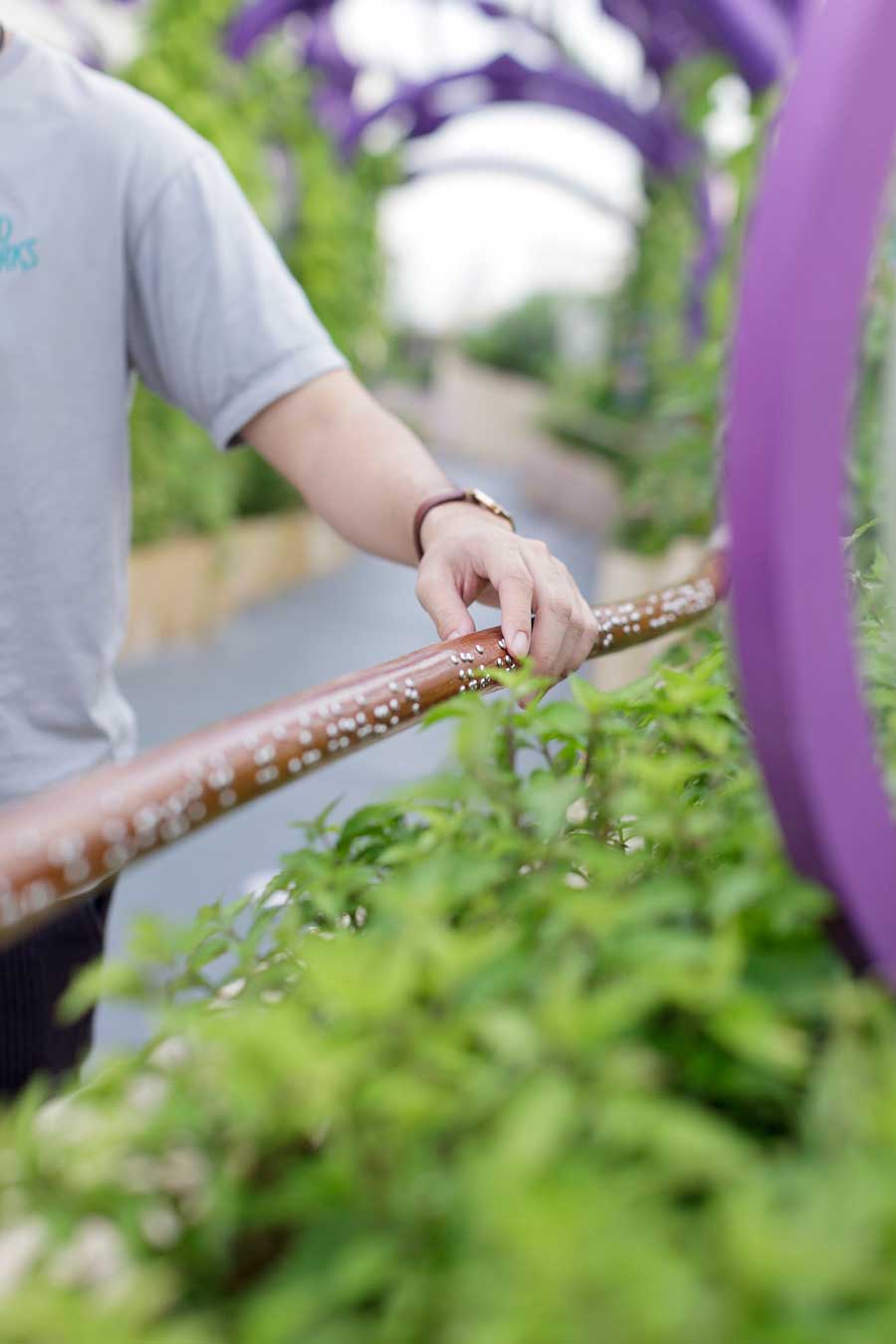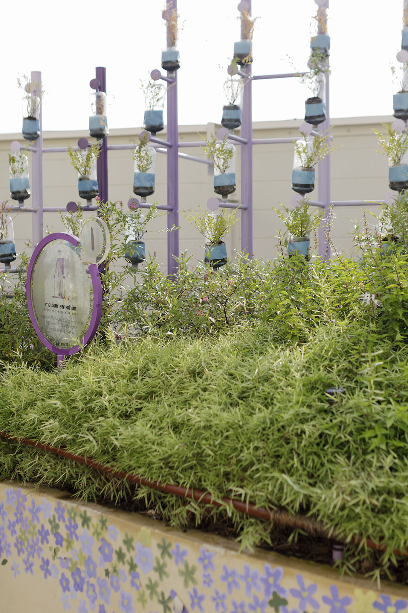 ทางเดินกายภาพบำบัดที่โรยด้วยหินกรวดขนาดเล็กใหญ่ สวนไม้ดอกหอมขนาบข้างตลอดเส้นทางที่มีทั้งปลูกลงแปลง และการใช้ขยะอนินทรีย์อย่างถุงน้ำเกลือกว่า 700 ถุงเป็นกระถางสำหรับปลูกประดับต้นไม้เป็นเสมือนสวนแนวตั้ง พาสู่มุ่งสู่อุโมงค์ซุ้มเหล็กสีม่วงให้ความงดงามและร่มเงาเป็นอย่างดี จนสุดลานสนามหญ้าโล่งสีเขียวสบายตา ส่วนนี้ติดตั้งราวจับไม้ตลอดทางเดินที่ไม่ได้เป็นเพียงแค่ราวจับช่วยพยุงตัวธรรมดา แต่มีผิวสัมผัสเป็นอักษรเบรลล์ บทเพลงพระราชนิพนธ์ในสมเด็จพระเทพรัตนราชสุดาฯ สยามบรมราชกุมารี มีเนื้อหาและท่วงทำนองเป็นเพลงรัก ให้ผู้พิการทางสายตาได้รื่นรมย์ในตลอดเส้นทางเดิน