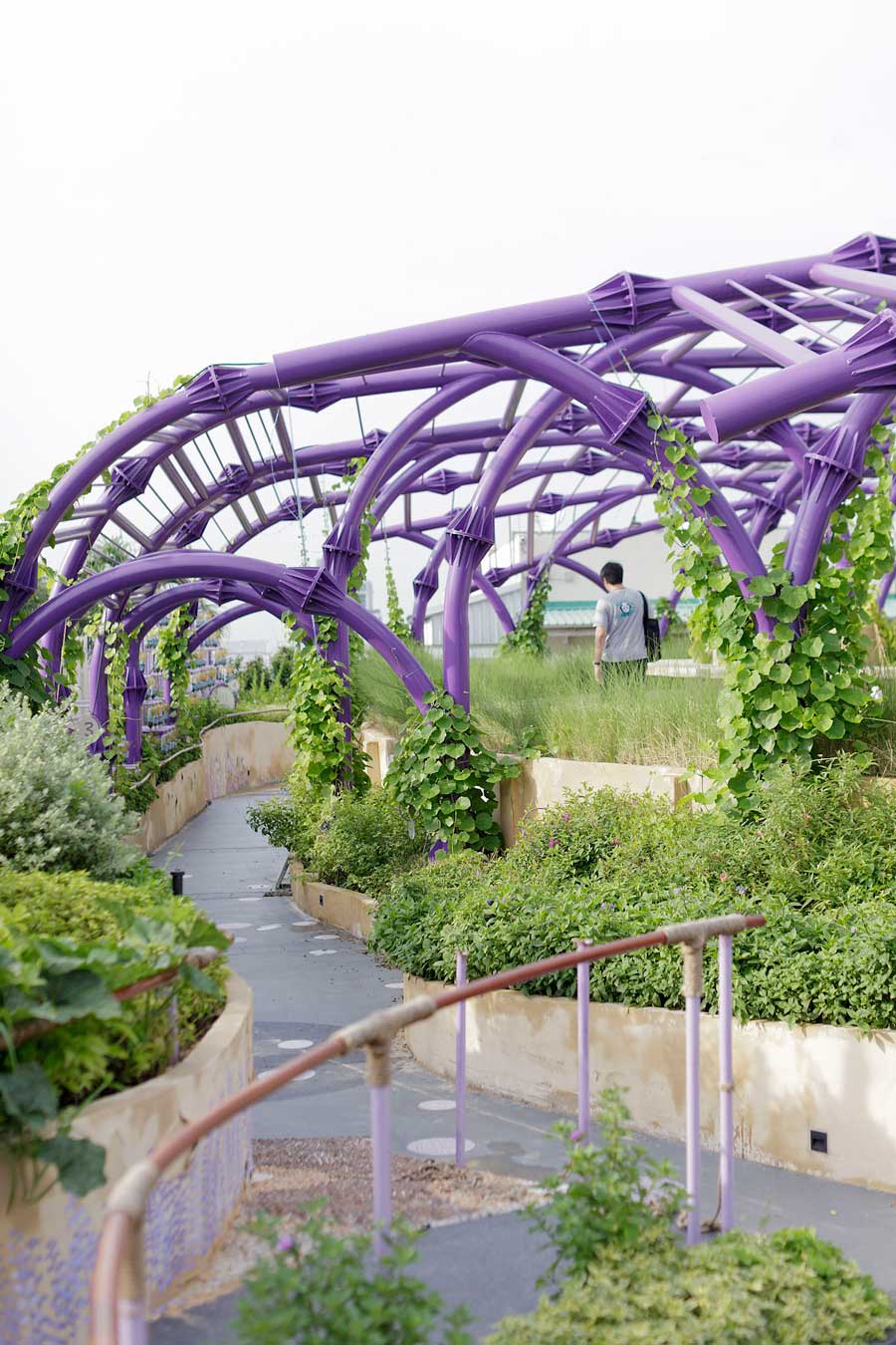 สวนผักดาดฟ้า เมื่อขึ้นไปสู่ชั้น 10 จากดาดฟ้าที่เราคิดว่าเป็นพื้นที่โล่งธรรมดาทั่วไปเหมือนตึกอื่นๆ แต่เมื่อเปิดประตูไปก็พบกับธรรมชาติย่อมๆ บนพื้นที่ขนาด 1,500 ตารางเมตร ซึ่งความพิเศษของสวนนี้ไม่ใช้แค่เป็นเพียงสวนสาธารณะหรือสวนหย่อมทั่วไป หากเป็น สวนบำบัด ฝีมืออาจารย์กชกร วรอาคม ภูมิสถาปนิกแห่ง LANDPROCESS ที่ตั้งใจออกแบบให้สวนแห่งนี้เป็นพื้นที่เยียวยาคนไข้ทั้งทางด้านร่างกายและจิตใจ หรือแม้กระทั่งบุคลากรในโรงพยาบาล การได้รับลมโชย สีเขียวเย็นตาจากต้นไม้ สีสันจากซุ้มไม้ดอก เส้นสายที่โค้งดูอ่อนช้อยสบายตา จึงเป็นสิ่งที่สวนแห่งนี้ตอบโจทย์ได้ดีทีเดียว