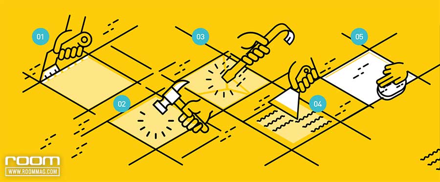 04 ใช้เกรียงป้ายกาวซีเมนต์บนพื้น ก่อนวางกระเบื้องแผ่นใหม่ลงไป โดยกะระยะให้แนวกระเบื้องตรงกัน
