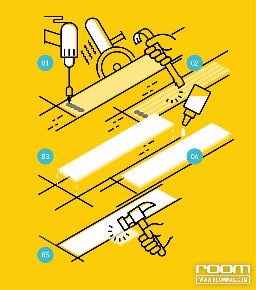 04 เมื่อทดลองจนแน่ใจว่าพอดี ให้ใช้กาวตะปูยึดแผ่นไม้เข้ากับพื้น
