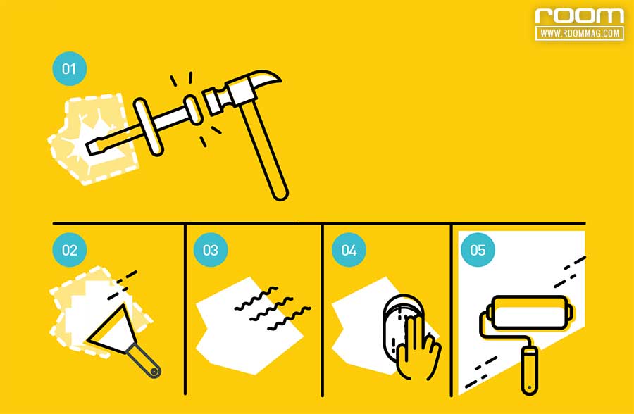 01 สกัดรอยร้าวให้ใหญ่ขึ้น พร้อมขูดสีโดยรอบออกให้หมด ใช้ฟองน้ําชุบน้ําหมาด ๆ เช็ด
