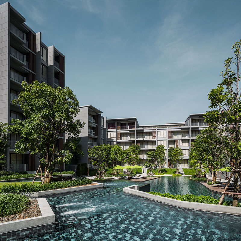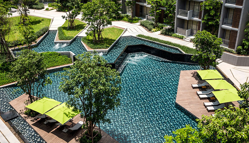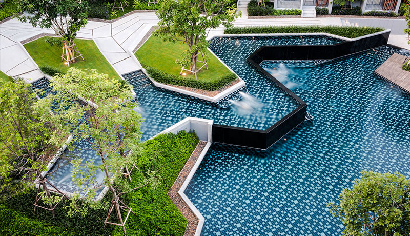 โดยเฉพาะอย่างยิ่งการนำไอเดียแลนด์สเคปมาใช้ในการดีไซน์สระว่ายน้ำ ด้วยการออกแบบให้สระว่ายน้ำเสมือนแอ่งน้ำธรรมชาติที่มีต้นกำเนิดจากแหล่งน้ำที่ไหลจากภูเขา ผนวกกับการดีไซน์ให้มีรูปทรงเลขาคณิตที่มีหลายเหลี่ยมหลายมุมและการเลือกใช้กระเบื้องเฉดฟ้า – เทา ทำให้สระว่ายน้ำดูทันสมัยแบบเรียบง่าย จนกลายเป็นความโดดเด่นและสะดุดตาของคอนโดมิเนียมแห่งนี้
