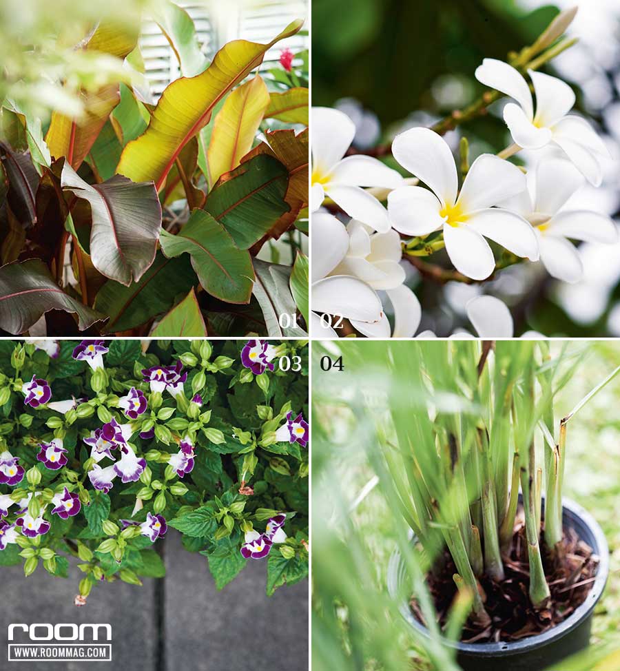 01 กล้วยแดง ไม้พุ่ม สูง 1.50 – 3 เมตร ลําต้นมีสีน้ําตาลเขียว ใบมีสีเขียวปนแดง นิยมปลูกเป็นฉากหลังของสวนหย่อมหรือจัดเป็นสวนไทย ชอบแดดครึ่งวัน ความชื้นปานกลาง