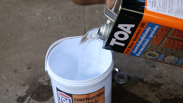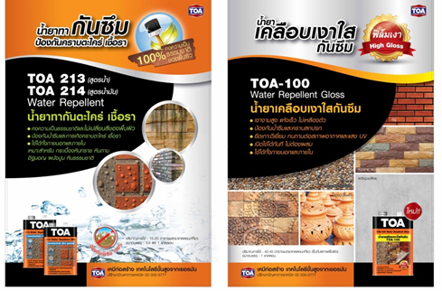 - น้ำยาทากันตะไคร่น้ำ เชื้อรา TOA 213 (สูตรน้ำ) ,214 (สูตรน้ำมัน) Water Repellent น้ำยาทากันตะไคร่น้ำ TOA Water Repellent มีคุณสมบัติป้องกันคราบเชื้อรา ตะไคร่น้ำ และป้องกันน้ำซึมเข้าสู่ผนัง ข้อดีคือสามารถทาเคลือบผิววัสดุโดยยังคงความเป็นธรรมชาติของพื้นผิว ไม่เปลี่ยนสีของวัสดุเดิม ทำให้พื้นผิวทนทานยาวนานปราศจากการรั่วซึม หรือคราบจับฝังบนพื้นผิว มีการยึดเกาะกับพื้นผิวดีเยี่ยม ทั้งยังทนทานกว่าน้ำยาซิลิโคนทั่วไป สามารถใช้ได้กับวัสดุกรุผิวหลากหลายแบบ เช่น คอนกรีต ปูน ปูนเปลือยขัดมัน อิฐมอญ หินทราย หินกาบ กรวดล้าง ทรายล้าง เป็นต้น แต่ไม่เหมาะกับวัสดุที่พื้นผิวมีเนื้อแน่นทึบ ผิวมันเงา เช่น หินแกรนิต หินอ่อน วัสดุสังเคราะห์ มีให้เลือกใช้ทั้งสูตรน้ำ และสูตรน้ำมัน ไม่ผสมสารปรอทและตะกั่ว