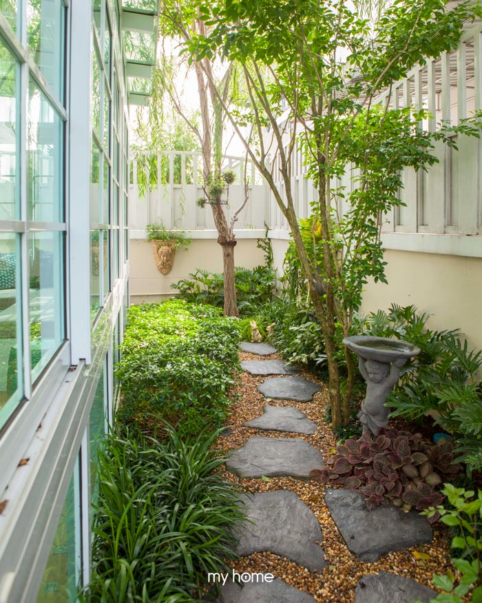 บริเวณที่แคบข้างเรือนกระจก จัดวางแผ่นหินธรรมชาติเป็นแนวทางเดินปลูกไม้พุ่ม และไม้คลุมดินเพื่อลดความแข็งกระด้าง และเปิดพื้นที่ให้ดูโปร่งโล่งใช้ร่มเงาจากแนวต้นไม้ใหญ่อย่างต้นหลิว และแคนาช่วยสร้างบรรยากาศร่มรื่นให้กับเรือนกระจก
