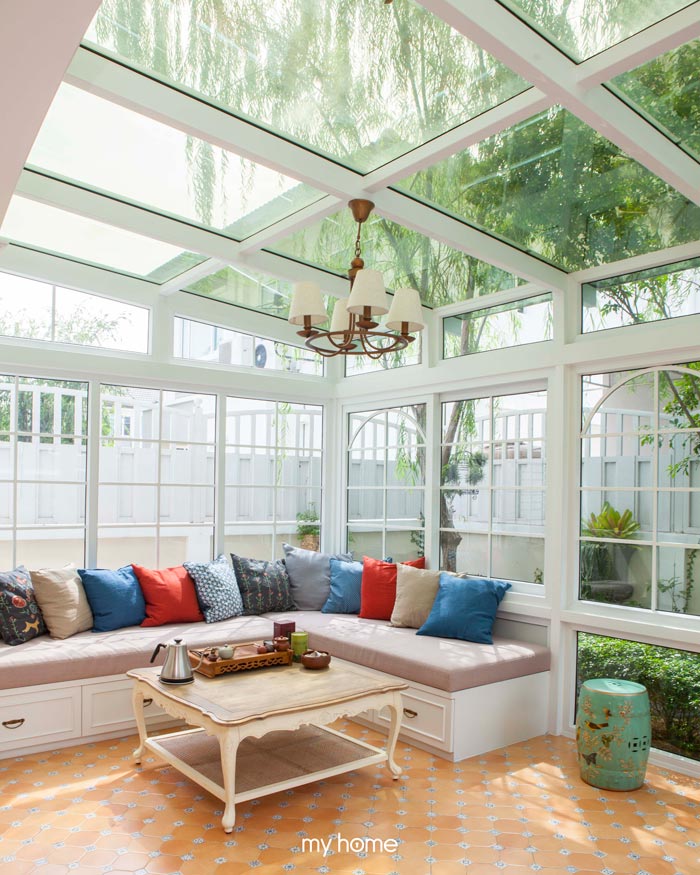เรือนกระจก (Glass House) ที่ต่อเติมออกมาจากตัวบ้าน กรุผนังกระจกใสจนถึงพื้นเพื่อเปิดมุมมองให้ดูโล่งสร้างความผ่อนคลายด้วยไม้ดอกหลากสีสันและไม้ใบแสนสวยรอบบ้าน