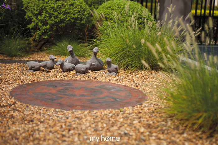 จัดวางองค์ประกอบแสง สี ผิวสัมผัส และองค์ประกอบ ศิลป์ต่าง ๆ เพื่อให้เกิดมิติของพื้นที่โดยมีจุดพักและจุดหยุดสายตา ทําให้ไม่ว่าจะมองจากมุมไหนภายในบ้านหรือสวนก็ดูสวย ซึ่งพื้นที่สวนด้านหน้าผมจัดเป็นมุมนั่งเล่นใต้ต้นไม้ใหญ่ล้อมรอบด้วยดอกพุดซ้อนที่มีกลิ่นหอมอ่อน ๆ ทําหน้าที่ต้อนรับเข้าสู่สวนและเชื่อมไปยังลานที่เปิดโล่งสําหรับทํากิจกรรมต่าง ๆ