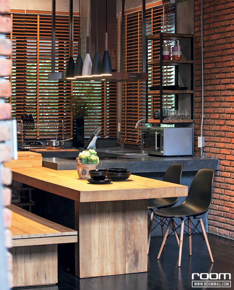 เพราะคุณตั้วชื่นชอบการทำอาหารและการสังสรรค์เป็นชีวิตจิตใจ มุมโปรดจึงหนีไปพ้นครัวและโต๊ะรับประทานอาหารตัวยาวที่ต่อออกจากไอส์แลนด์ครัวสไตล์อินดัสเทรียลดิบเท่ สะท้อนคาแร็กเตอร์ของเจ้าของบ้านอย่างชัดเจน เก้าอี้ฝั่งหนึ่งเป็นม้านั่งยาวหน้ากว้าง จึงไม่ต้องหวั่นใจแม้จะมีแขกมาร่วมปาร์ตี้มากมาย
