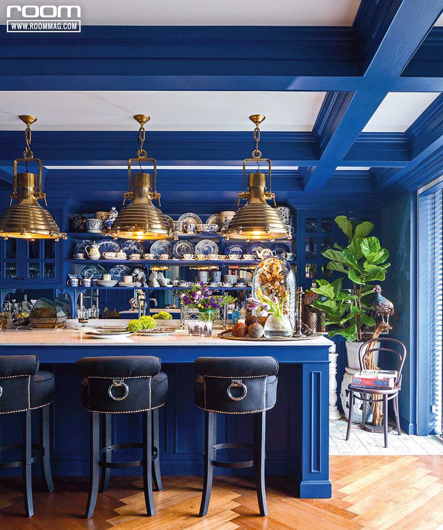 เพราะเป็นคนชอบเดินทางท่องเที่ยว เดินดูฟลีมาร์เก็ตที่ต่างประเทศ มุมโปรดของคุณโด๊ตจึงหนีไม่พ้นชั้นวางงานเครื่องกระเบื้องซึ่งเป็นสีขาว-น้ำเงิน การออกแบบมุมนี้จึงกําหนดค่าสีหลักในบ้านสองสี คือ สีน้ําเงิน Great Harbor และสีม่วง Debutante Violet ของ Ralph Lauren ซึ่งได้มาจากสีวอลล์เปเปอร์ ของ Hermès Paris ที่คุณโด๊ตชอบและซื้อเก็บไว้