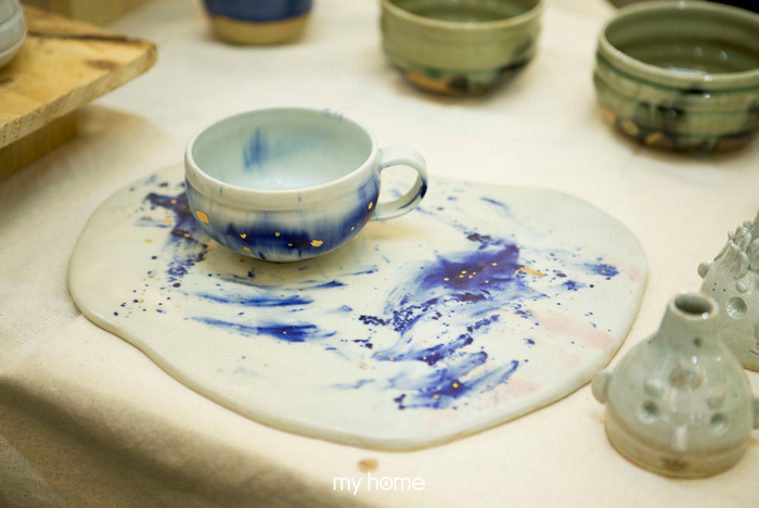 งานเซรามิกที่บินตรงมาจากงานคูล ๆ ที่เมืองเชียงใหม่อย่างงาน nap ครั้งนี้ขอมาเป็นน้องใหม่ในงานบ้านและสวนแฟร์จ้า ขนเอางานเซรามิกมาอวดให้คนกรุงเทพฯได้ยลโฉมความงดงามอย่างนอบน้อม สิ่งแรกที่พุงเข้าไปทำความรู้จักเลยคงเป็นชุดแก้วพร้อมจานรองสีฟ้า ที่มีการแต้มหยดทองลงไปเล็ก ๆ ชุดนี้แหละค่ะ จะเรียกว่า love@first sight เลยก็ได้ค่ะ สงสัยจะตกหลุมรักหนุ่มเชียงใหม่ผู้นอปน้อมคนนี้เข้าซะแล้วซิ