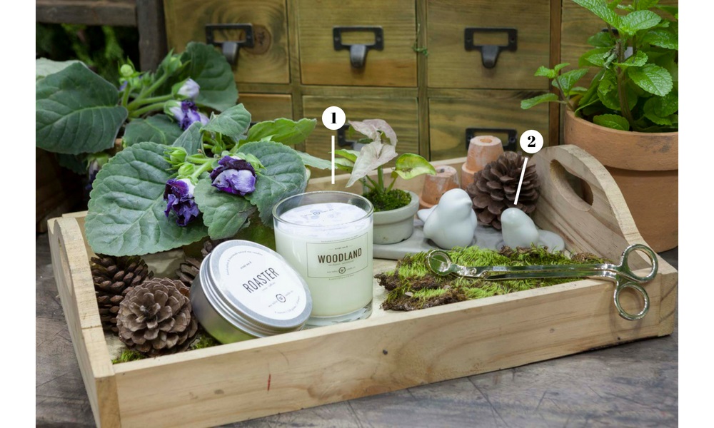 เลือกหากระบะเตี้ยๆ มาสักหนึ่งอันแล้ววางพวกลูกสนแห้ง กระถางต้นไม้เล็กๆสีเขียวดูสนชื่น ที่มาพร้อมตุ๊กตานกเซรามิกน่ารักๆดูมีชีวิตชีวาขึ้น เพิ่มความผ่อนคลายด้วยกลิ่นหอมๆของเทียนอโรม่า เพียงแค่นี้ก็ช่วยทำให้มุมห้องหรือมุมสวนของคุณผ่อนคลายขึ้นได้ ที่สำคัญยังง่ายต่อการเคลื่อนย้ายอีกด้วย จะยกไปวางตรงไหนก็สะดวก