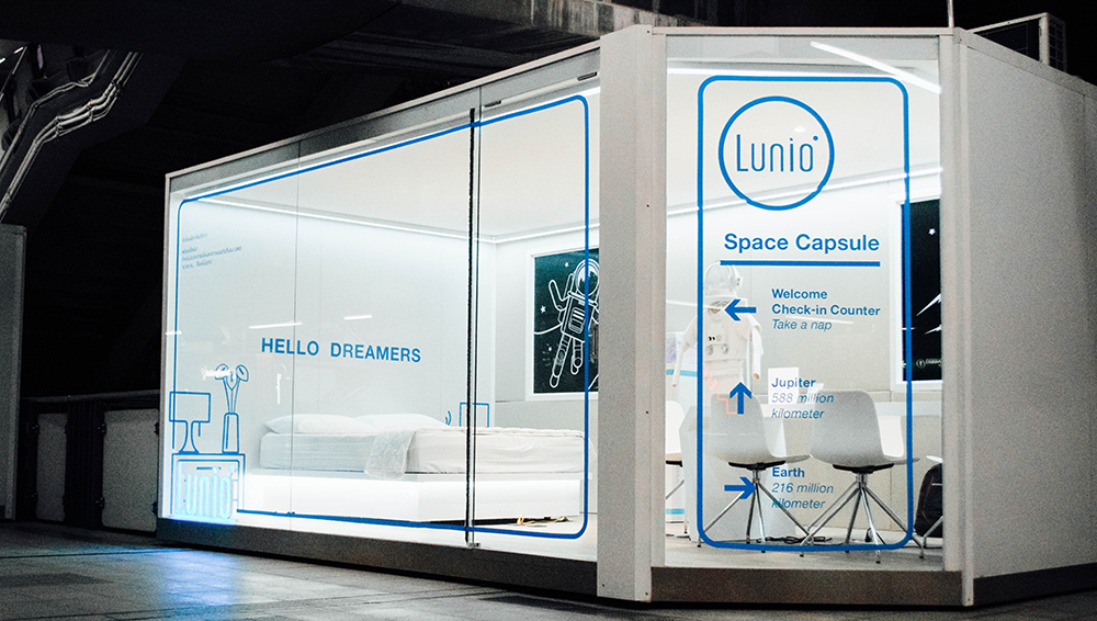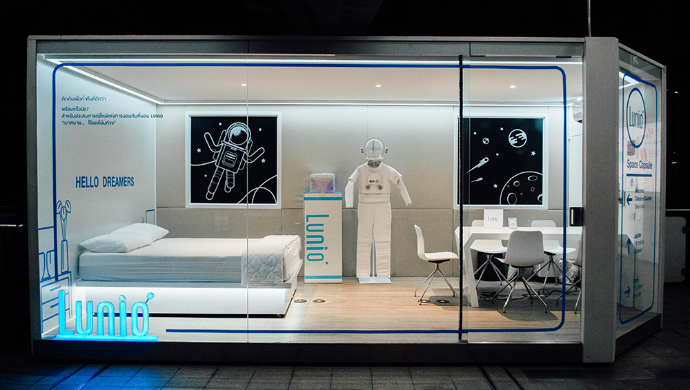 ในด้านของ Showroom ทางแบรนด์ Lunio ยังได้ปรับเปลี่ยนหน้าร้านใหม่ให้เข้ากับแคมเปญเป็น Theme “SPACE CAPSULE” เพื่อสร้างประสบการณ์และความแปลกใหม่ในการซื้อที่นอนยางพาราไฮบริดให้แก่ลูกค้าอีกด้วย